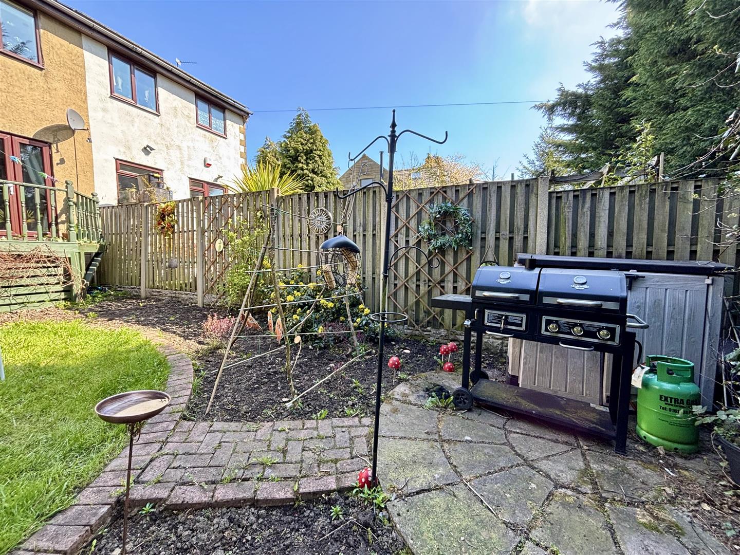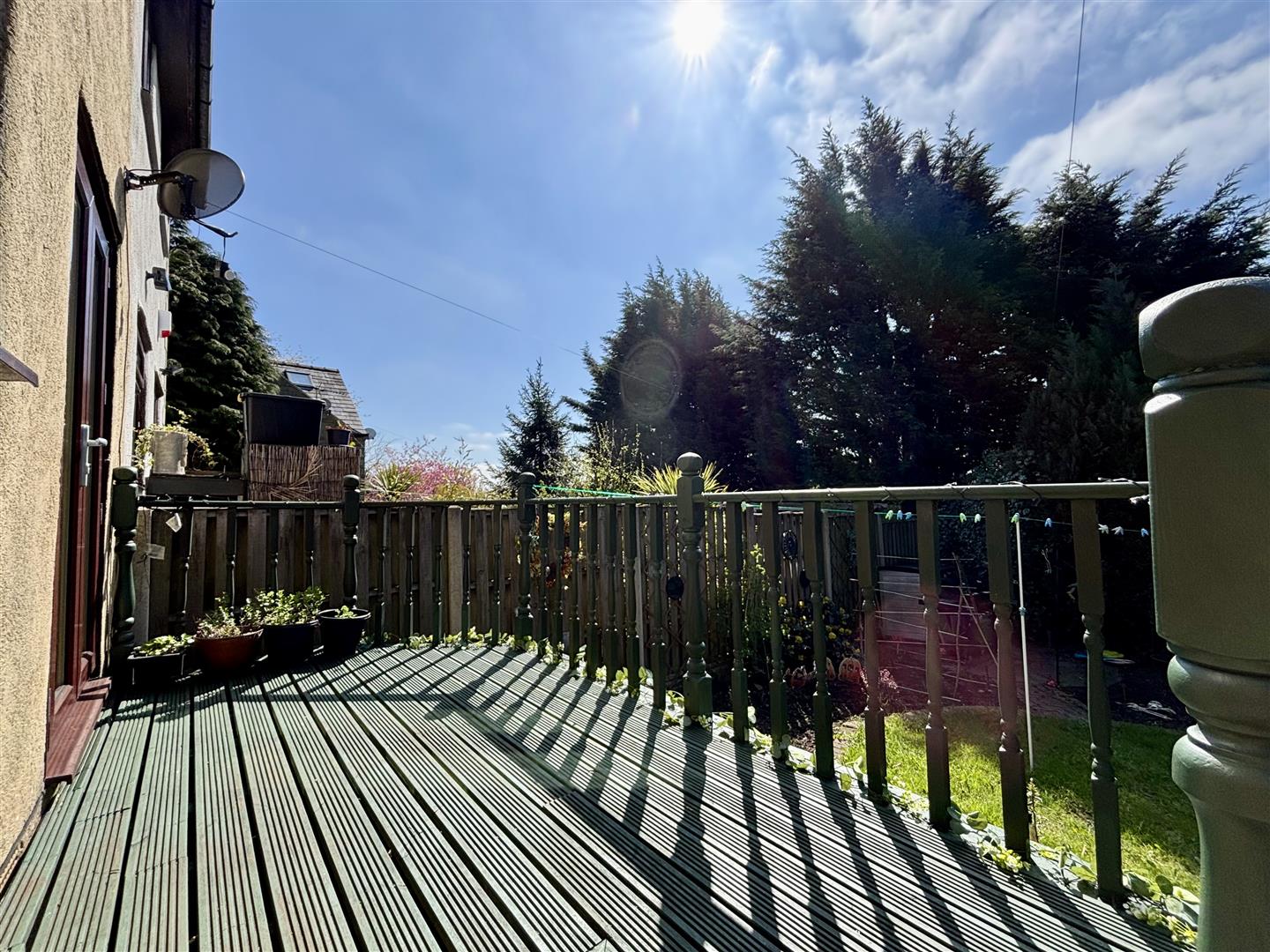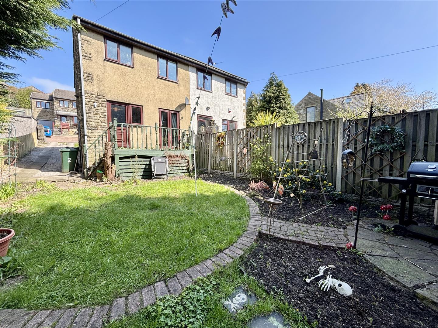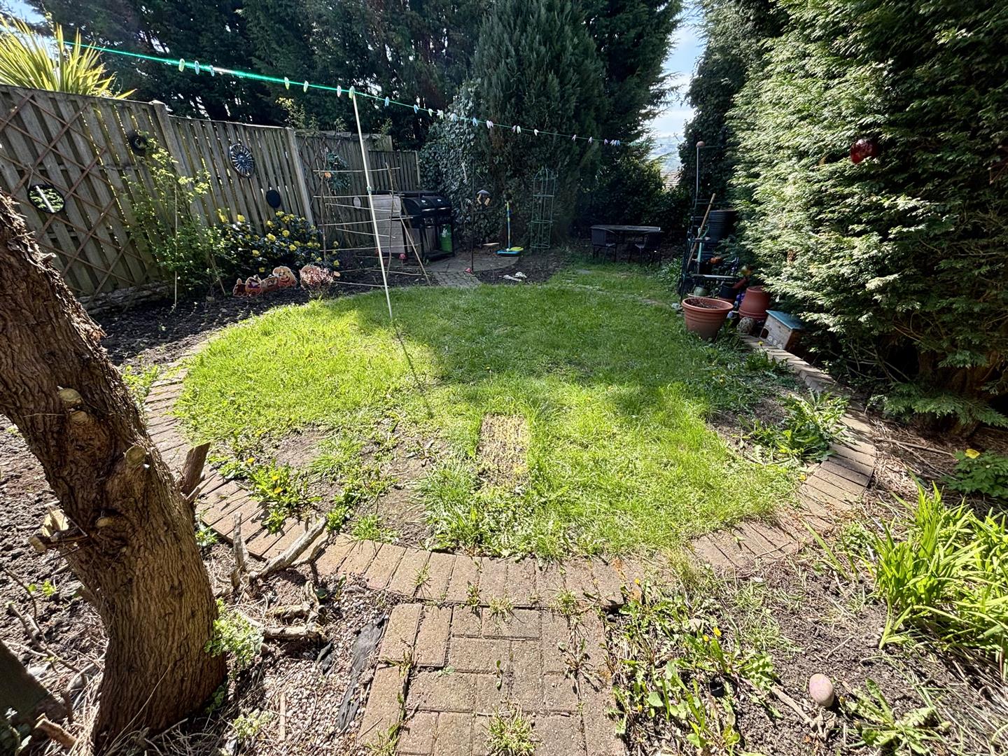To the front of the property is an open plan lawned area and access to the driveway with parking for 2-3 cars. The rear garden has a raised deck/balcony, circular lawn, paved patio, flower beds, BBQ area and a range of mature shrubs and trees.