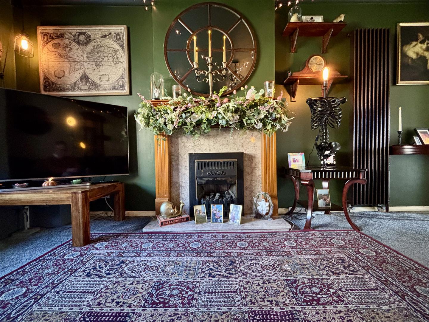 A cosy living room with a living flame gas fire set in a modern surround with a marble back and plinth, bay window to the front elevation, double doors to the dining room, under-stairs storage cupboard and a vertical central heating radiator.