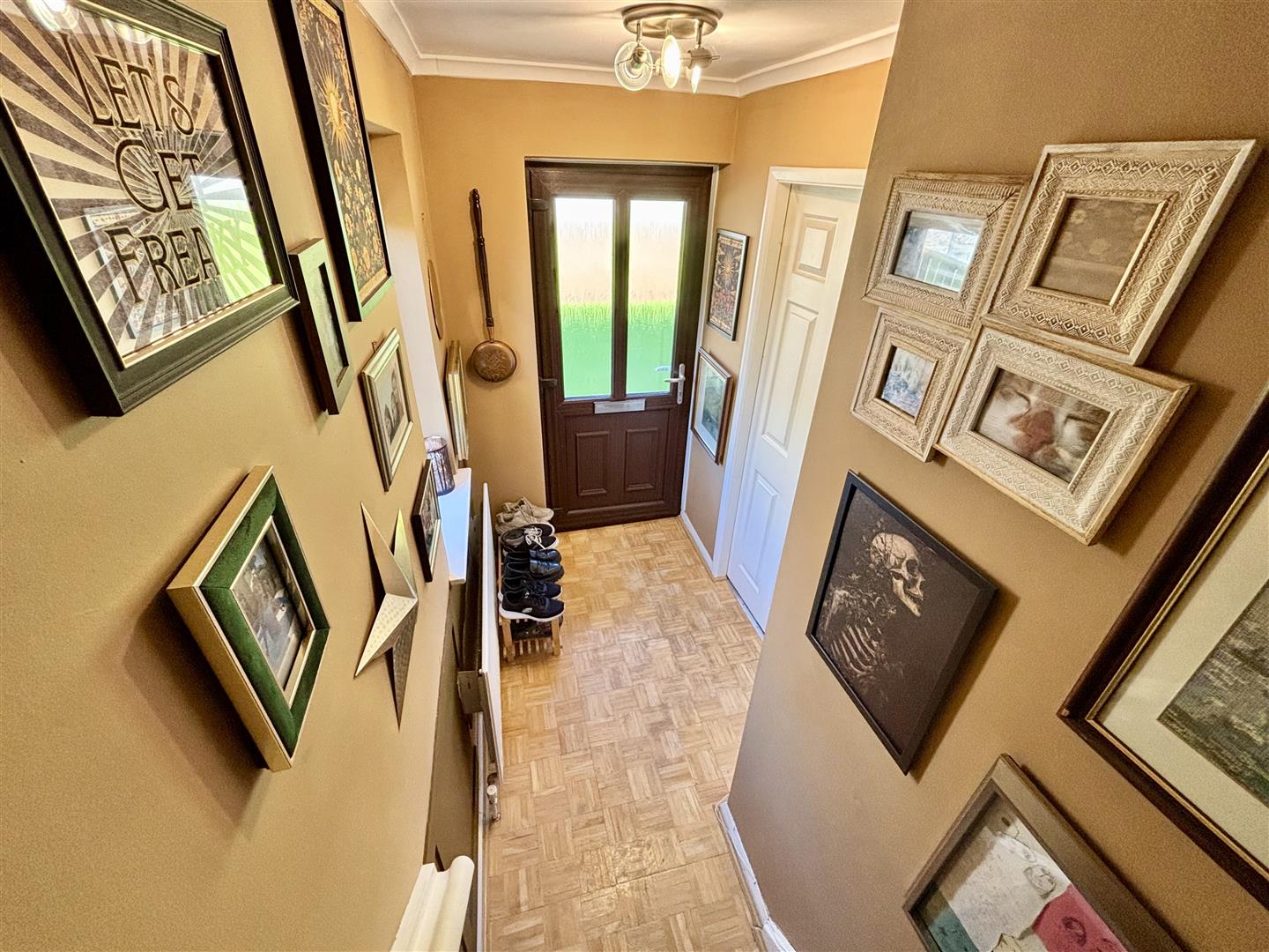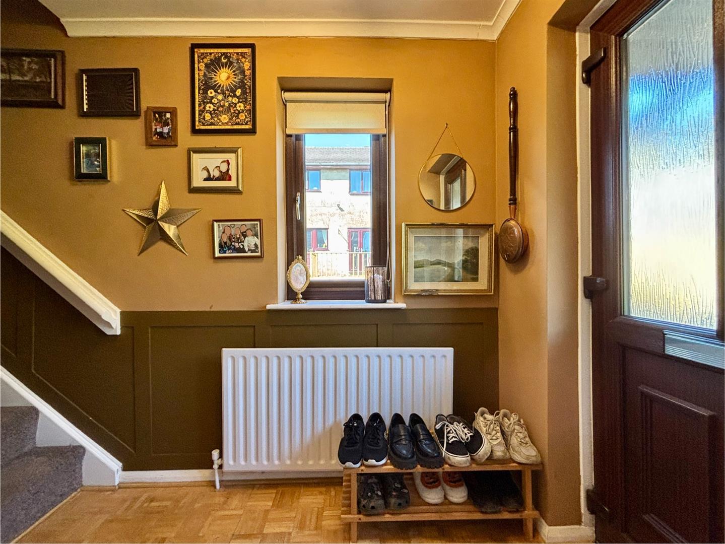 Stairs lead off to the first floor, window the side elevation, parquet flooring, feature wall panelling and a central heating radiator.
