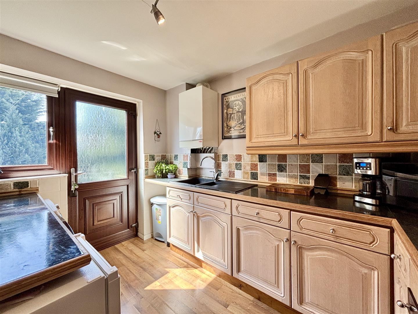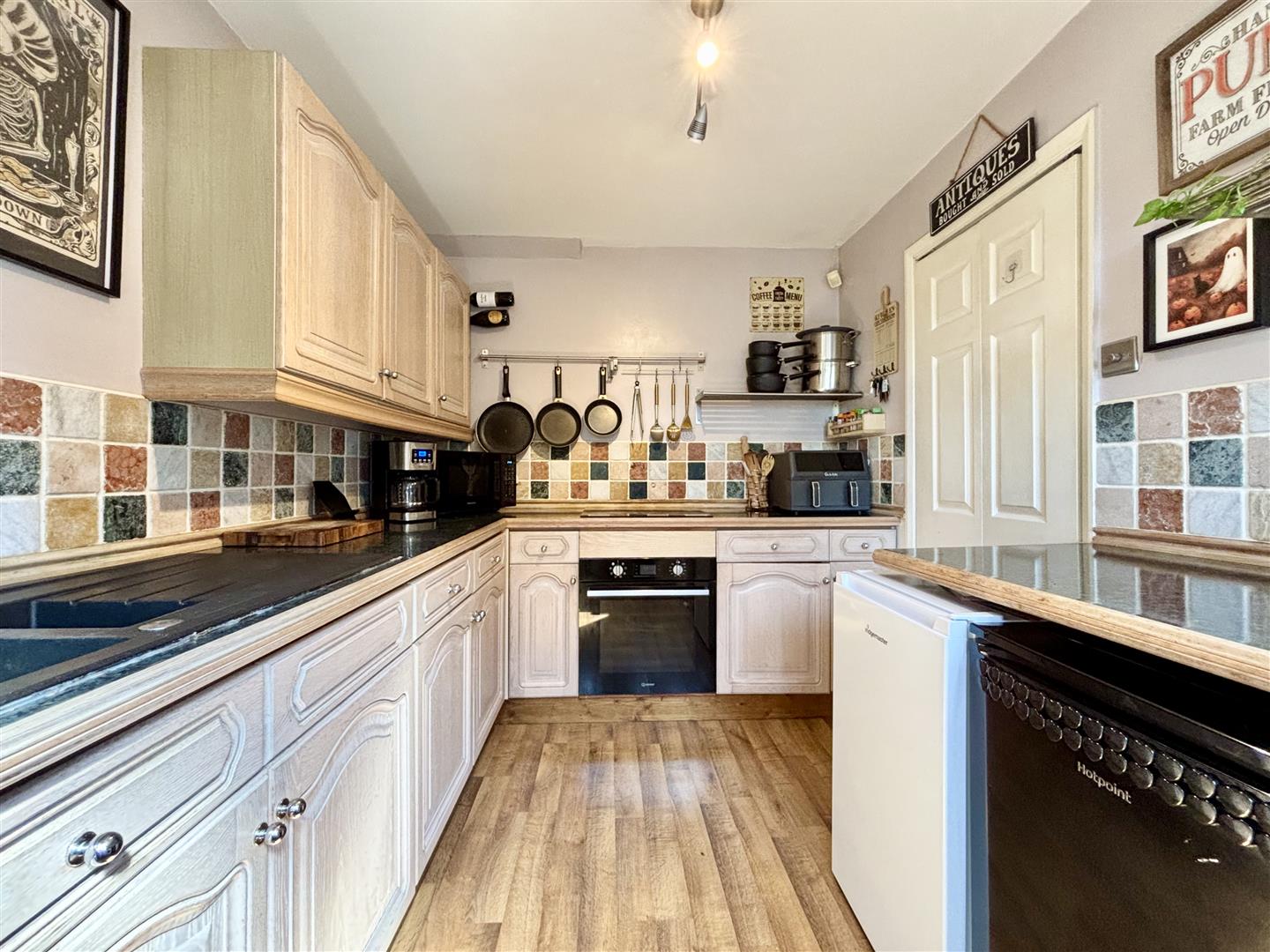 Fitted with a modern range of base and wall units with work surfaces over and splash-back wall tiling. Integrated electric oven, electric hob, plumbing for a washing machine and a composite sink & drainer with mixer tap. Window and exterior door to the rear elevation.