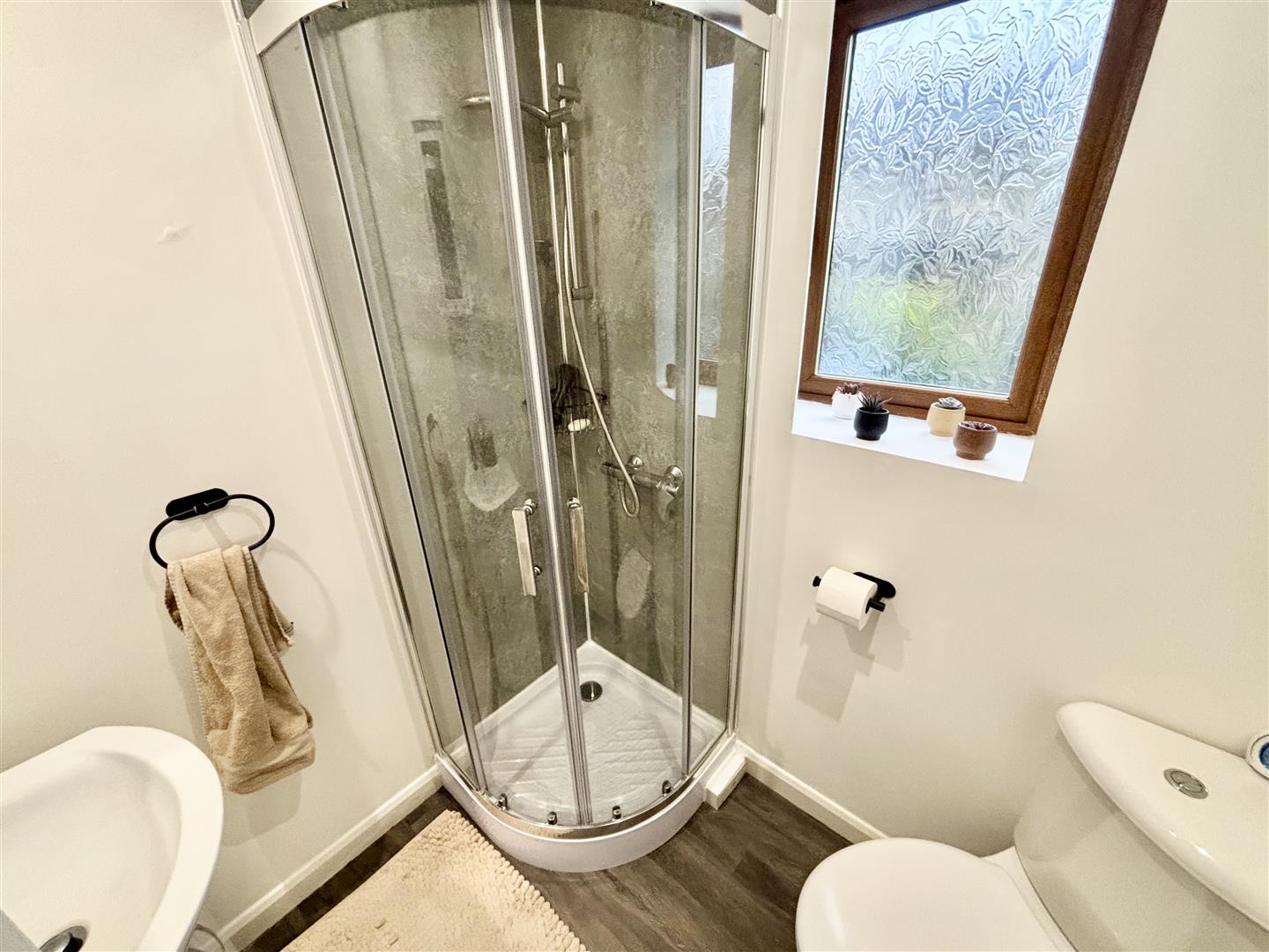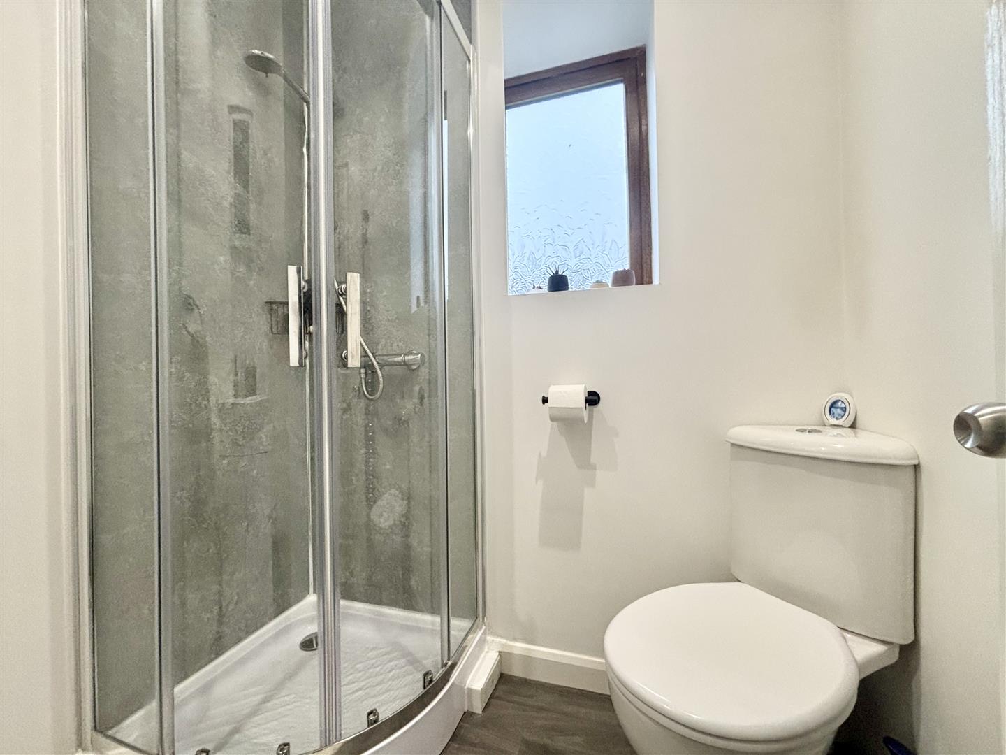 A modern shower room comprising of a corner shower cubicle with sliding doors and a mains gas powered shower, corner WC and a washbasin with storage below. Chrome heated towel rail and a window to the front elevation.