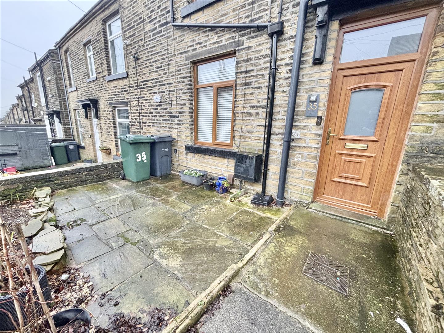 To the front of the property is a paved patio garden area with stone wall boundary and garden gate.