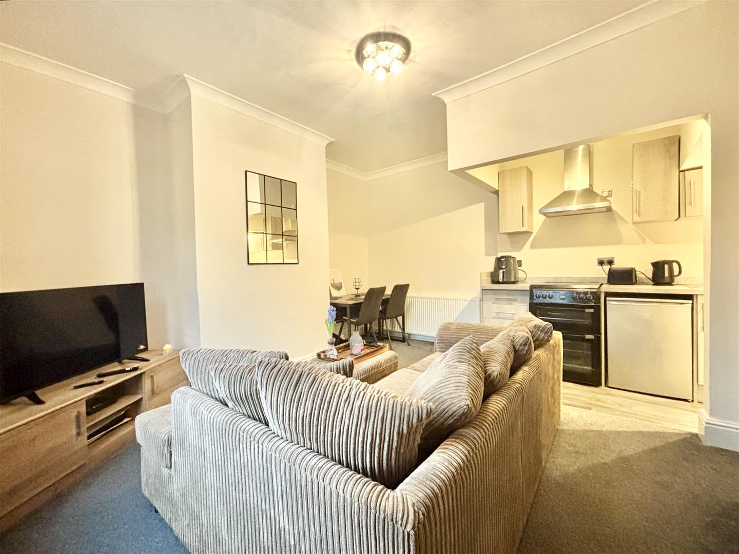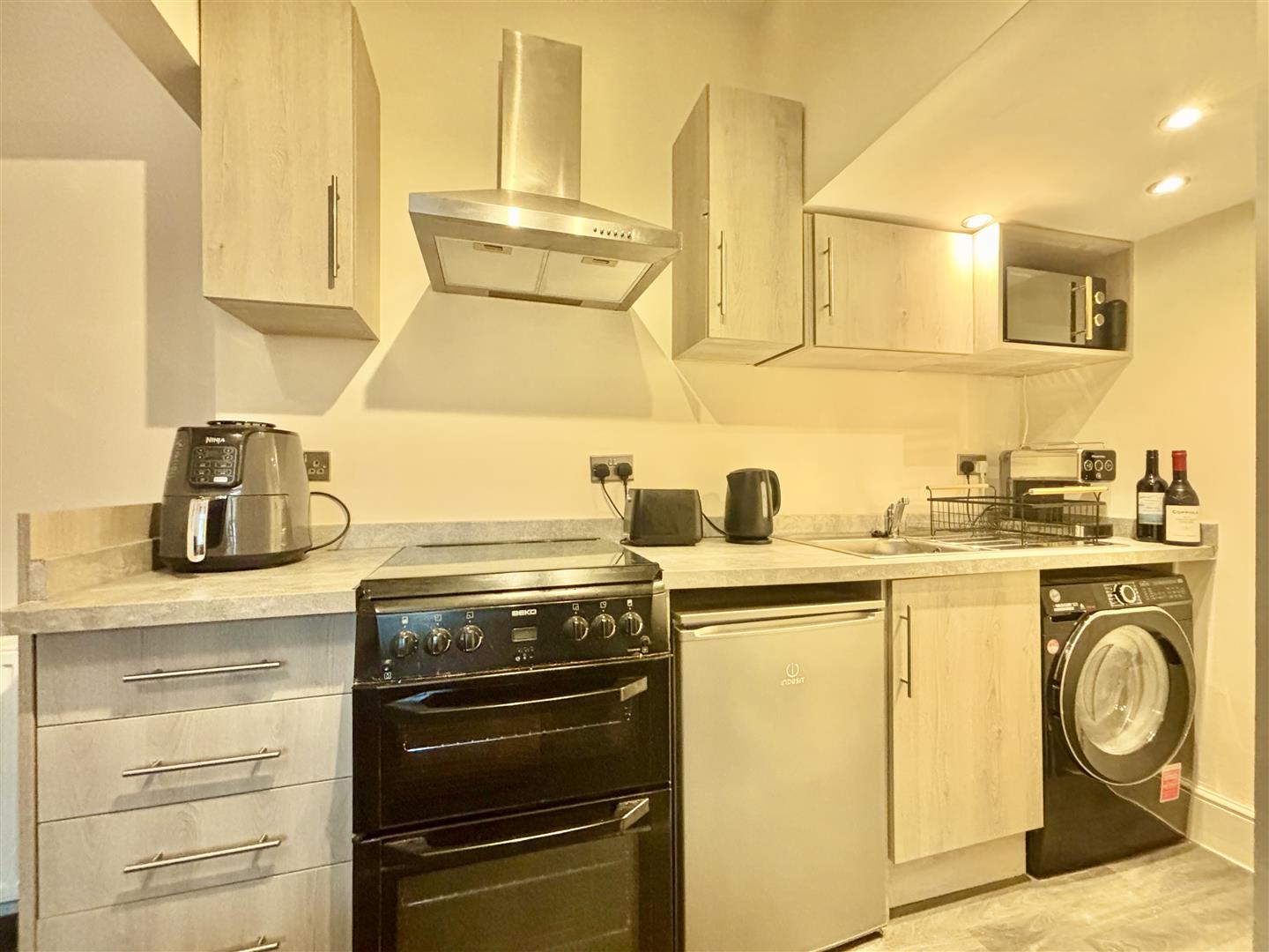 A modern fitted kitchen area with base and wall units, laminated work surfaces, stainless steel sink & drainer and a gas cooker with extractor above. Plumbing for a washing machine and a door to the cellar space.