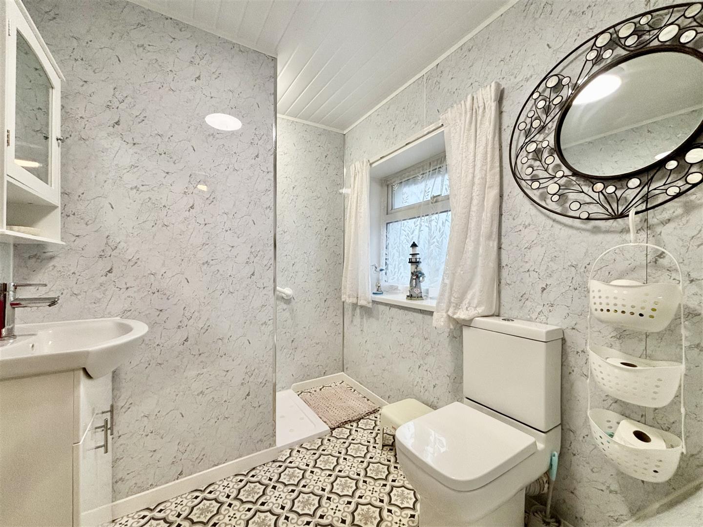 A modern shower room comprising of a low flush WC, washbasin with mixer tap and storage below plus a walk-in shower area with a rainfall shower. Window to the side elevation and a central heating radiator.