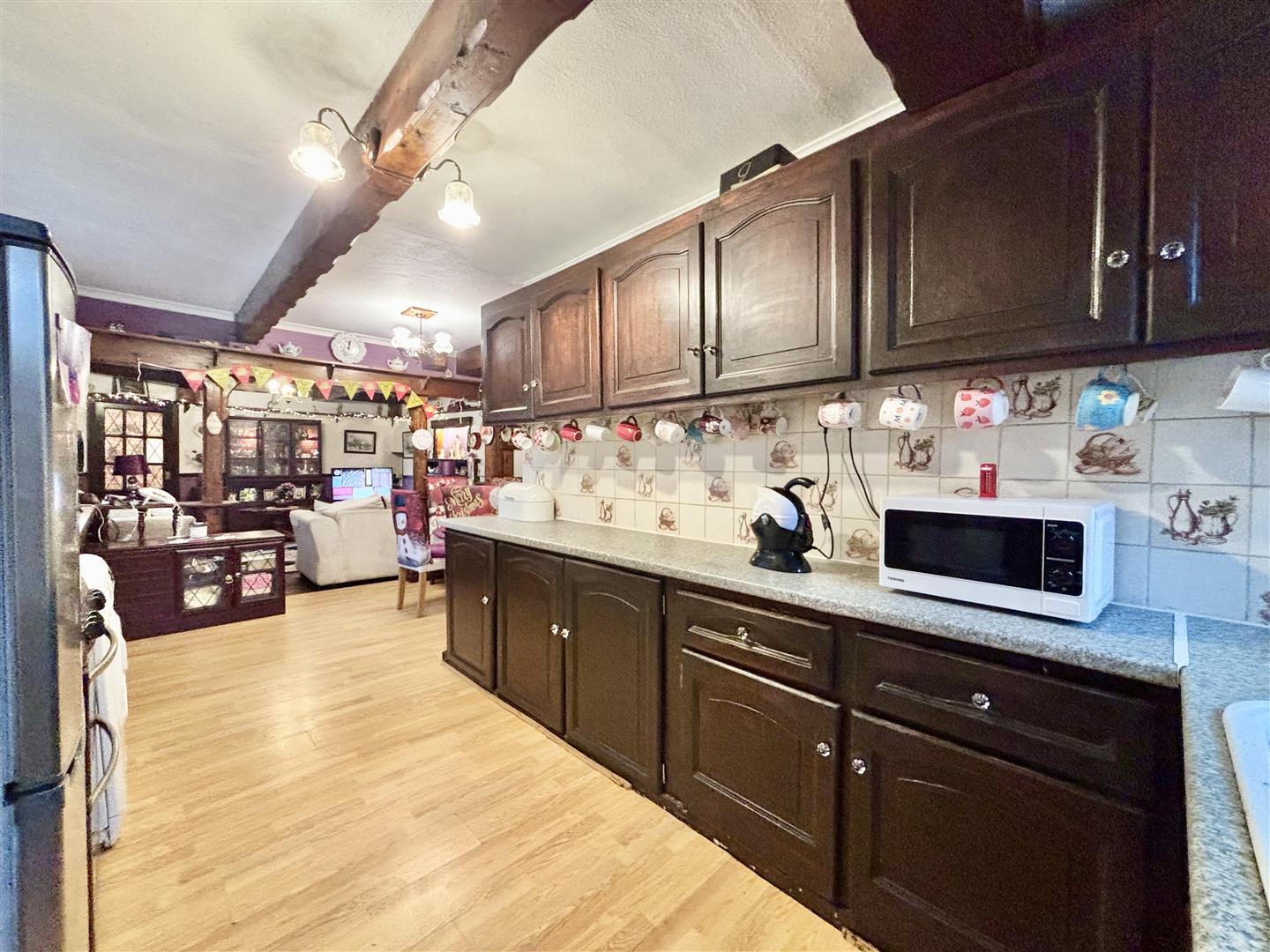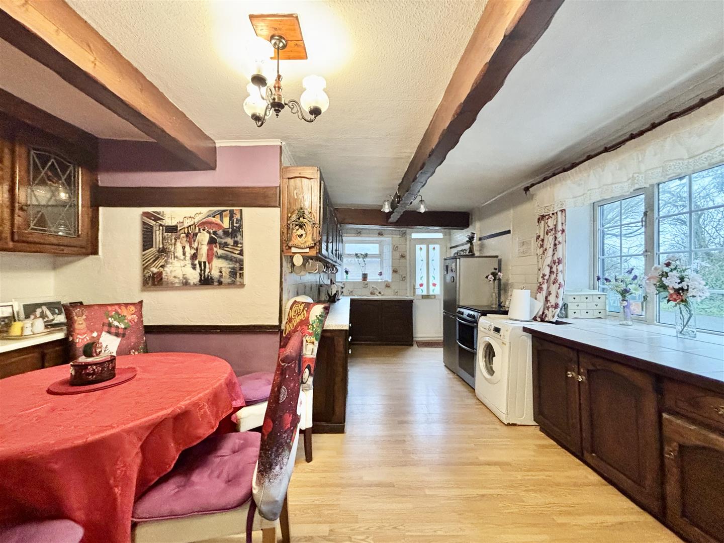 A fitted kitchen with designated space for a dining table and chairs, being partially open with the lounge. Fitted with a range of base and wall units, laminated work surfaces and splash-back wall tiling. Laminate flooring, gas cooker point, plumbing for a washing machine and a sink & drainer with mixer tap. Exposed beams and woodwork. Windows to the front and side elevations and a side entrance door. Central heating radiator.