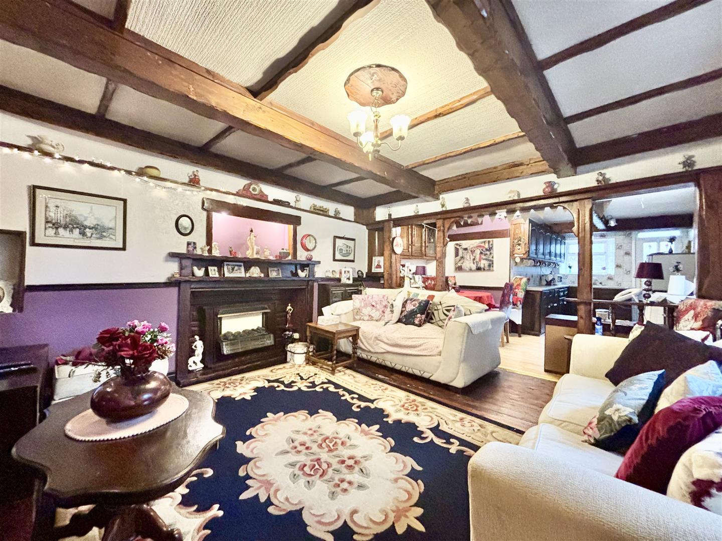 A characterful room with exposed beams and a feature fireplace with an electric fire, window to the front elevation, stripped wood floor and a central heating radiator.