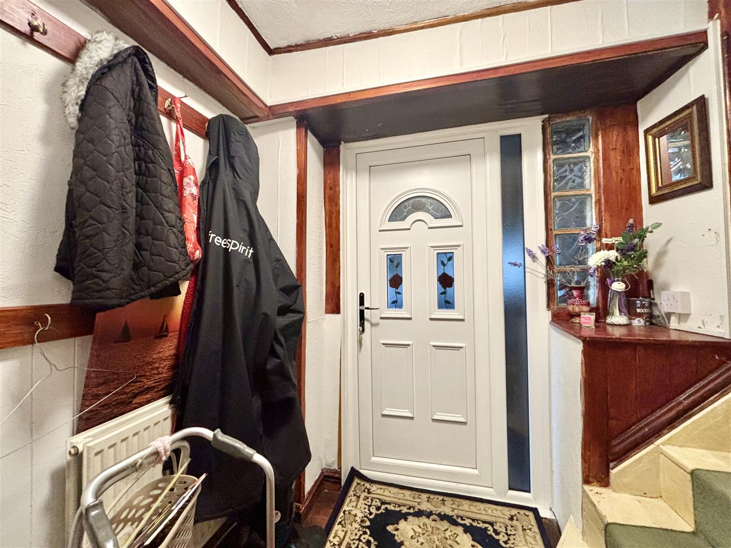 Stairs to the first floor and a side entrance door leading from the car port. Central heating radiator.