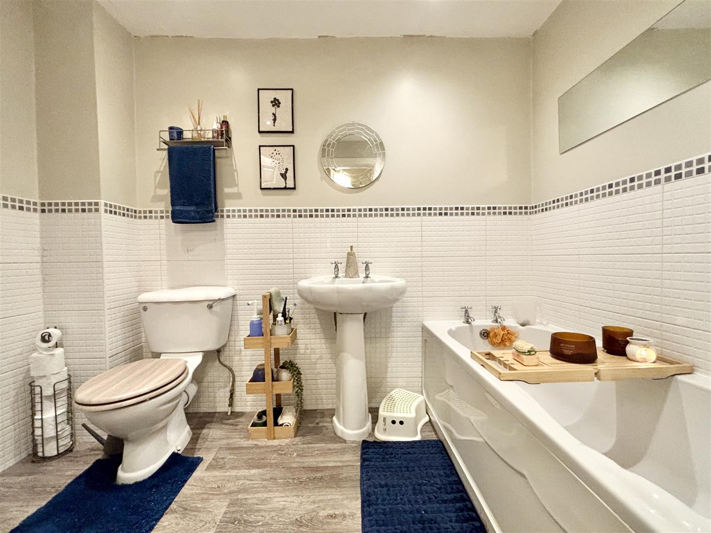 Modern three piece suite in white, half tiled walls, panelled bath, pedestal washbasin and a low flush WC. Central heating radiator.