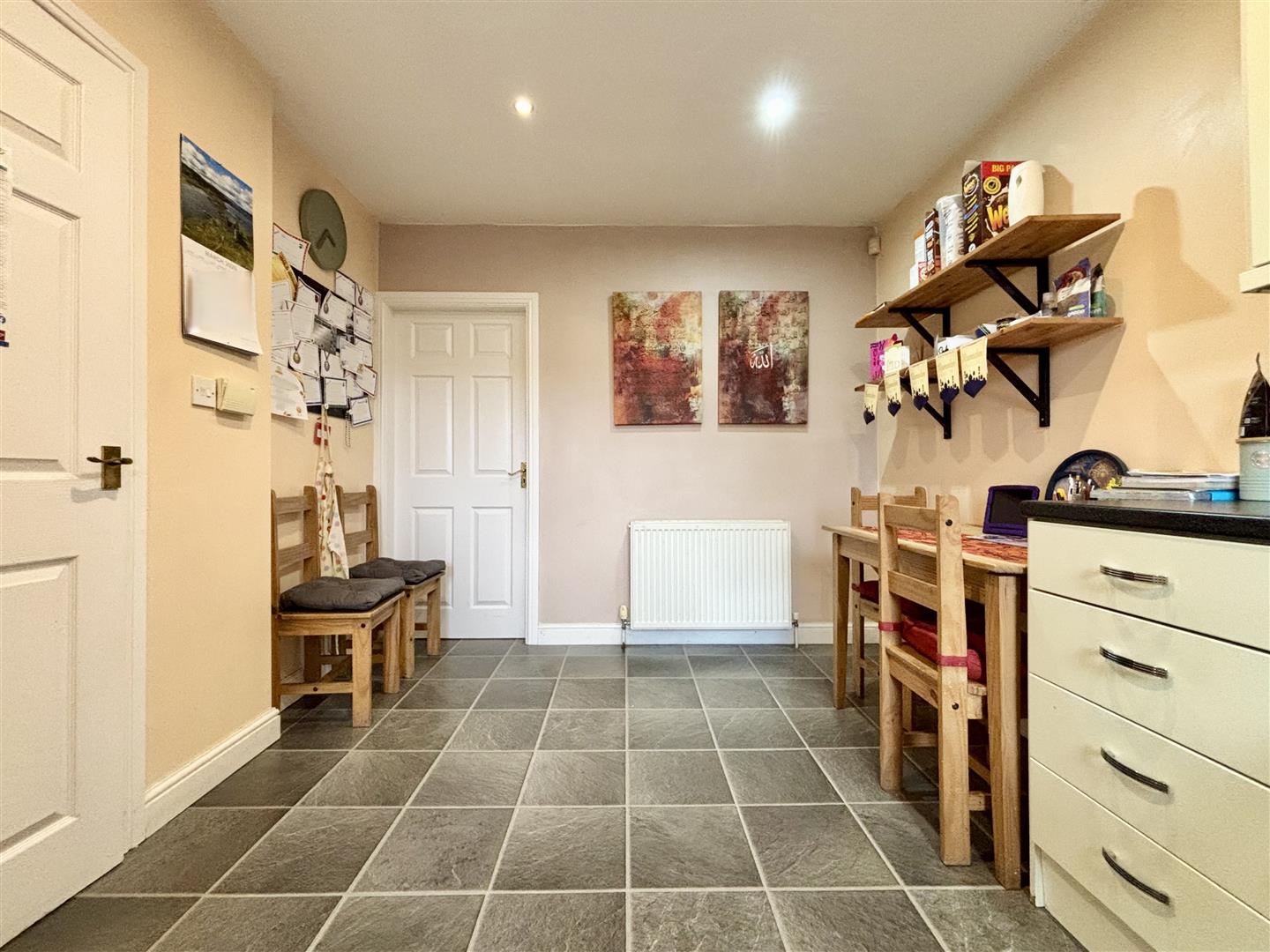 A spacious kitchen with ample space for dining and fitted with a range of wall & base units in cream with contrasting work surfaces & splash-back tiling. Stainless steel sink with drainer & mixer tap, integrated electric oven & four ring gas hob, extractor fan, integrated fridge freezer & dishwasher, central heating radiator and a window to the front. Door to the integral garage.