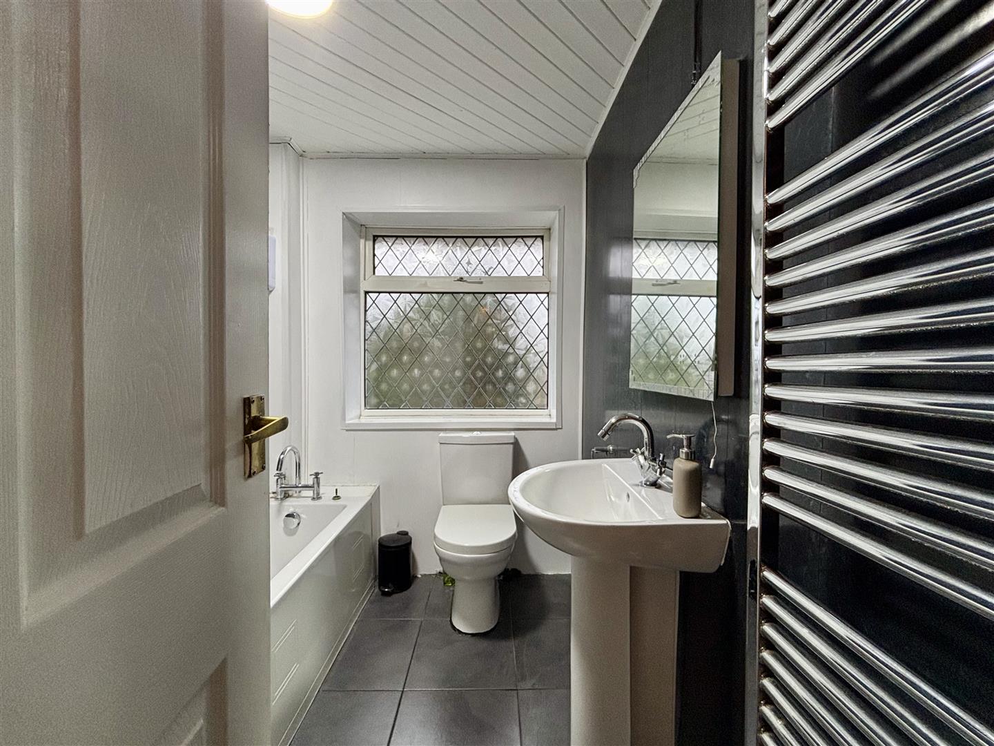 White three piece suite comprising of low flush WC, wash basin and a panelled bath with an electric shower over. Double glazed window and a heated towel rail.