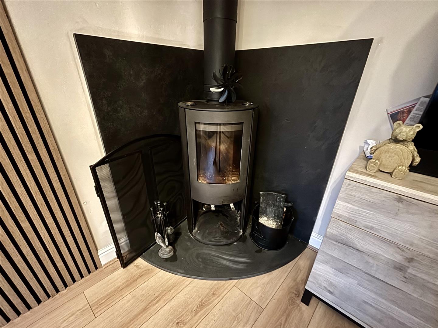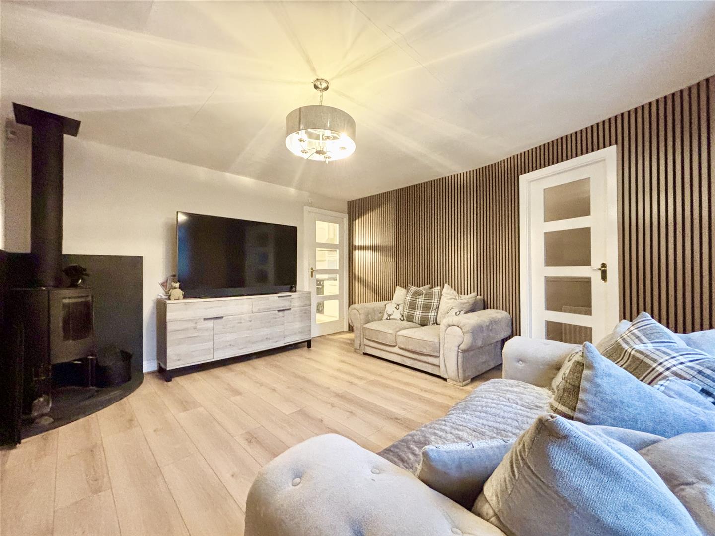 Bay window to the front elevation, feature wall panelling, laminate flooring and an impressive corner multi-fuel stove that has been recently fitted. Central heating radiator and under-stairs storage.