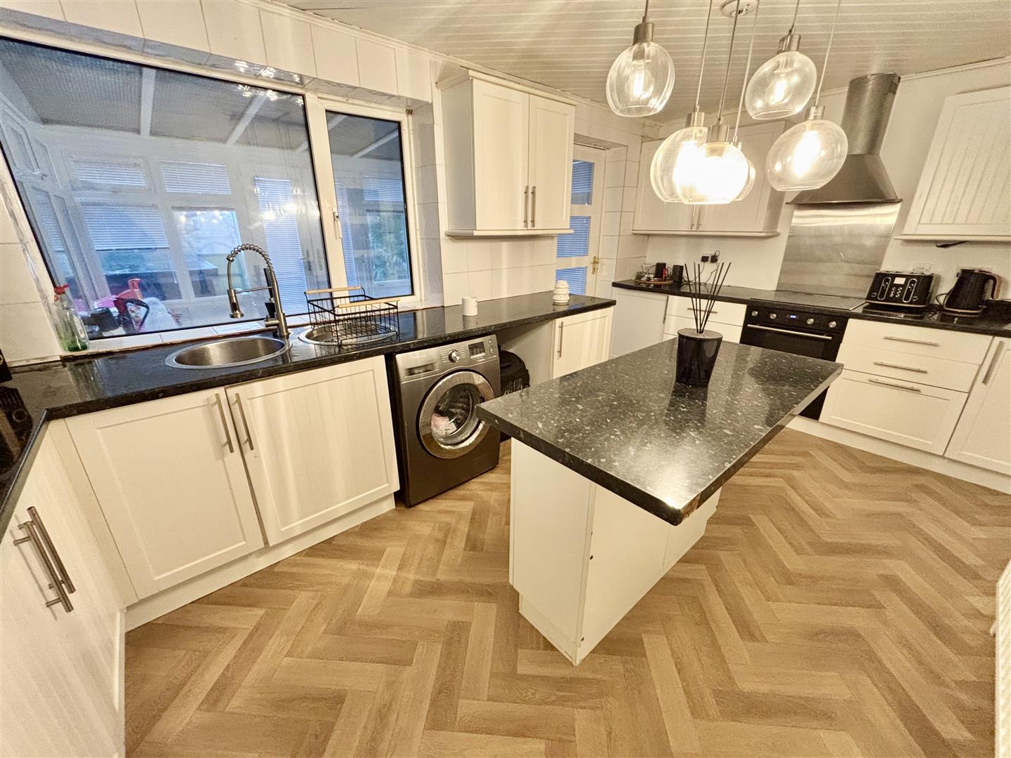 Fitted wall and base units, matching island with breakfast bar, stainless steel sink unit, plumbing for a washing machine and a window to the rear elevation. Door to: