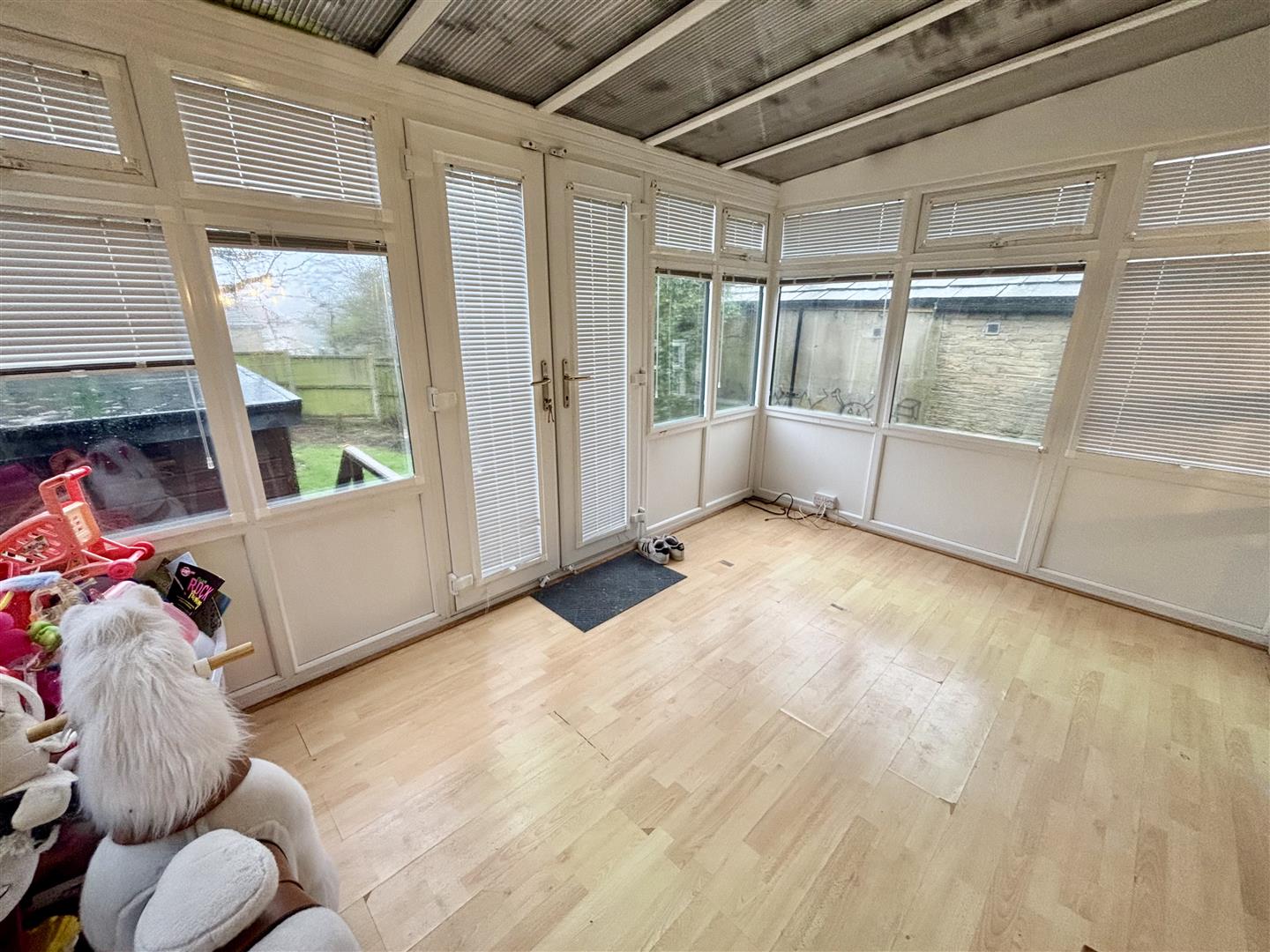 White uPVC conservatory with laminate flooring, central heating radiator and integrated louvre blinds.