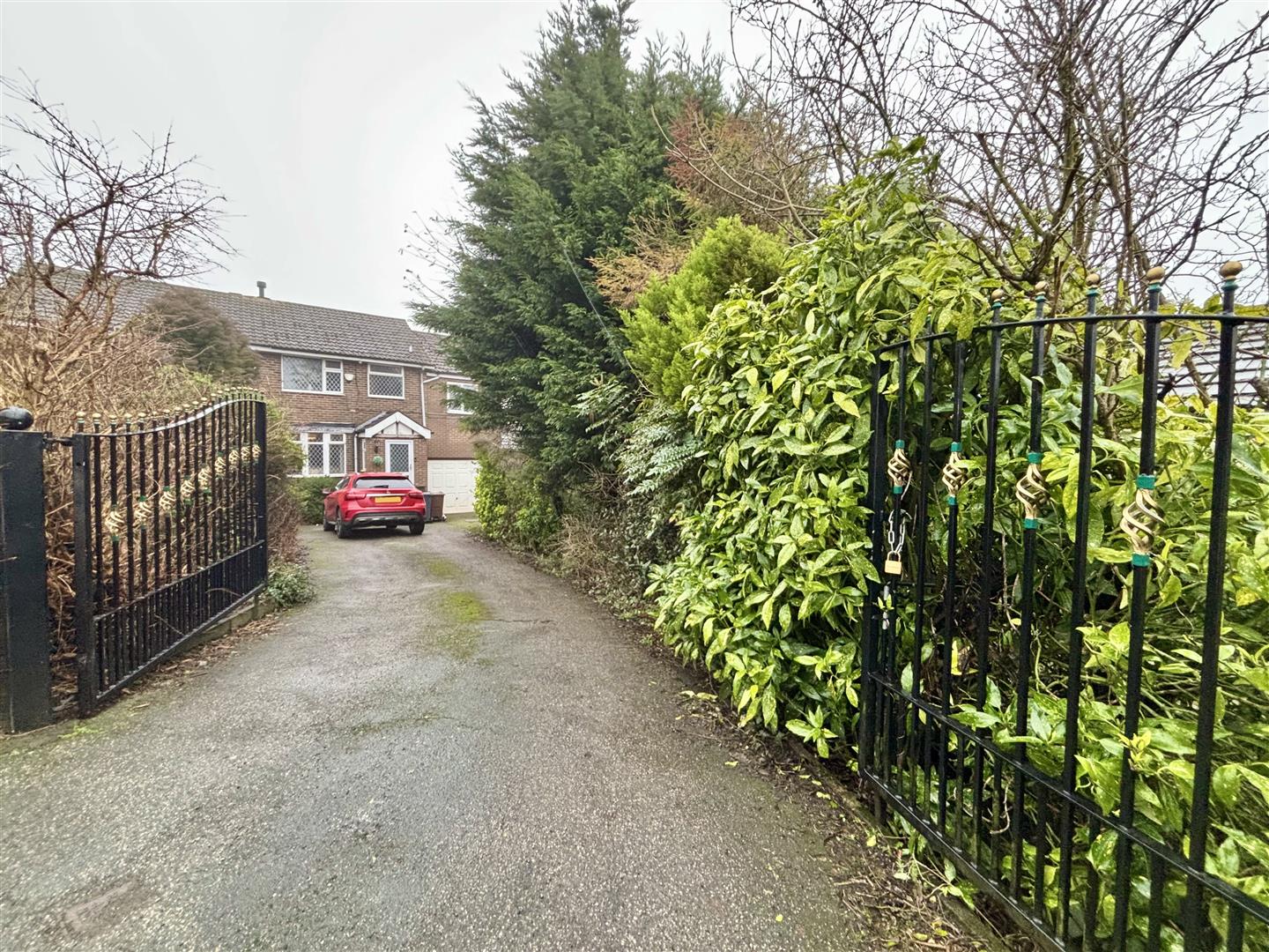Gated driveway to the front for several cars, large tandem garage and an enclosed rear garden. with lawn, shed, flowerbeds and mature shrubs/trees.