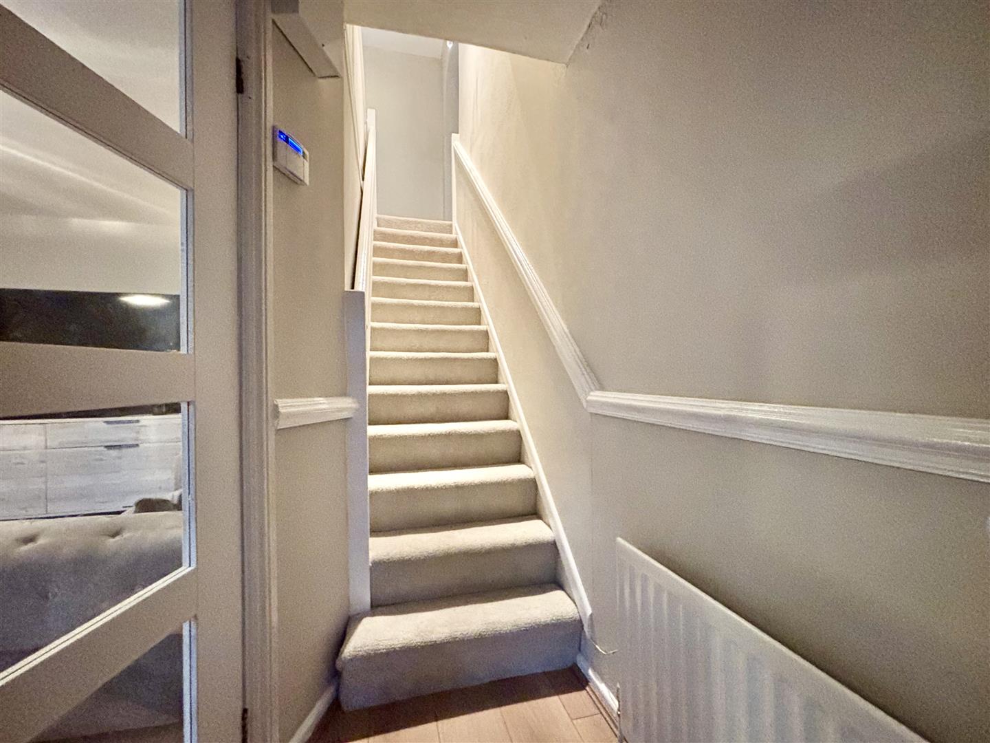 Stairs to the first floor, door to the lounge, laminate flooring and a central heating radiator.