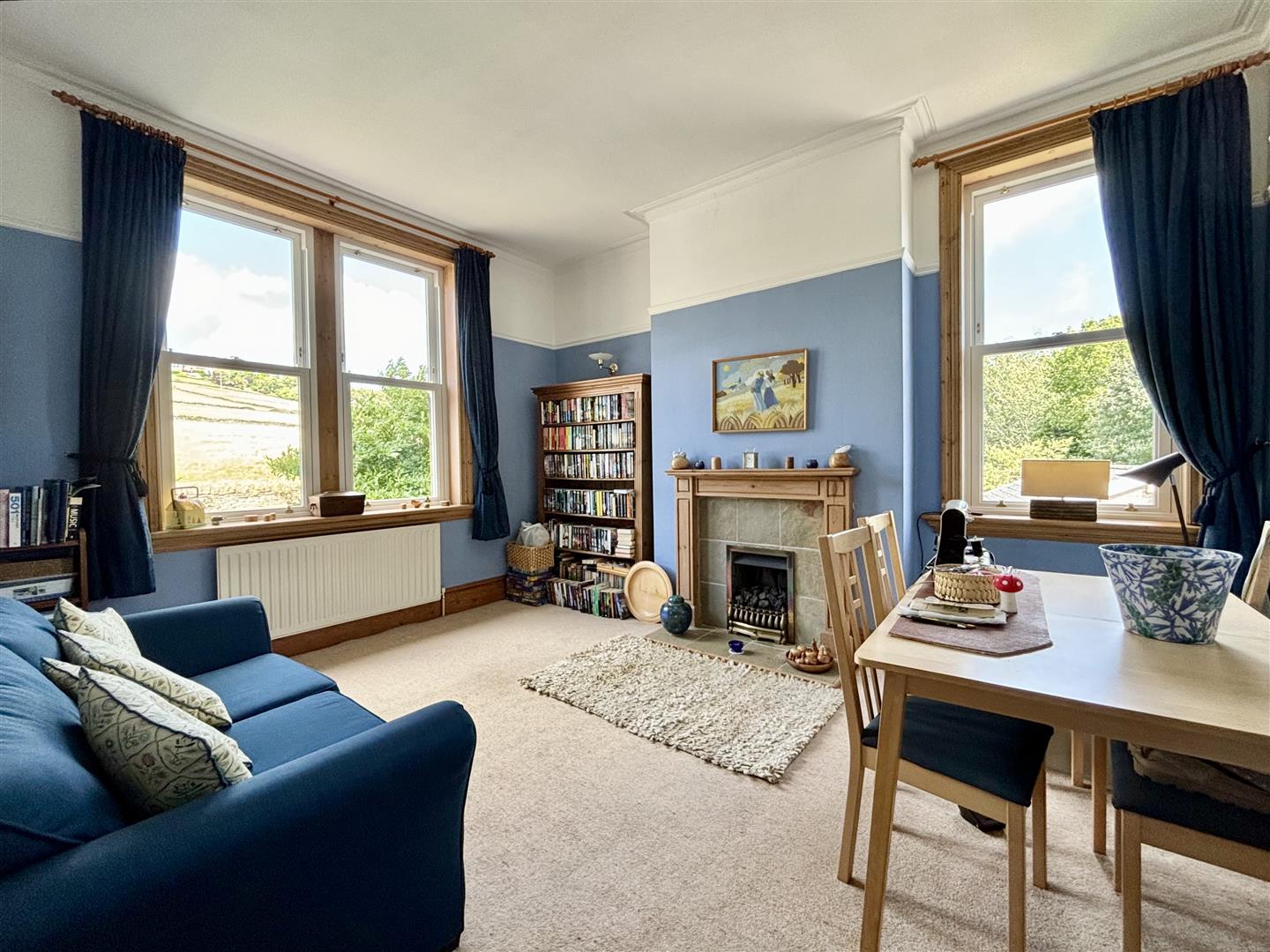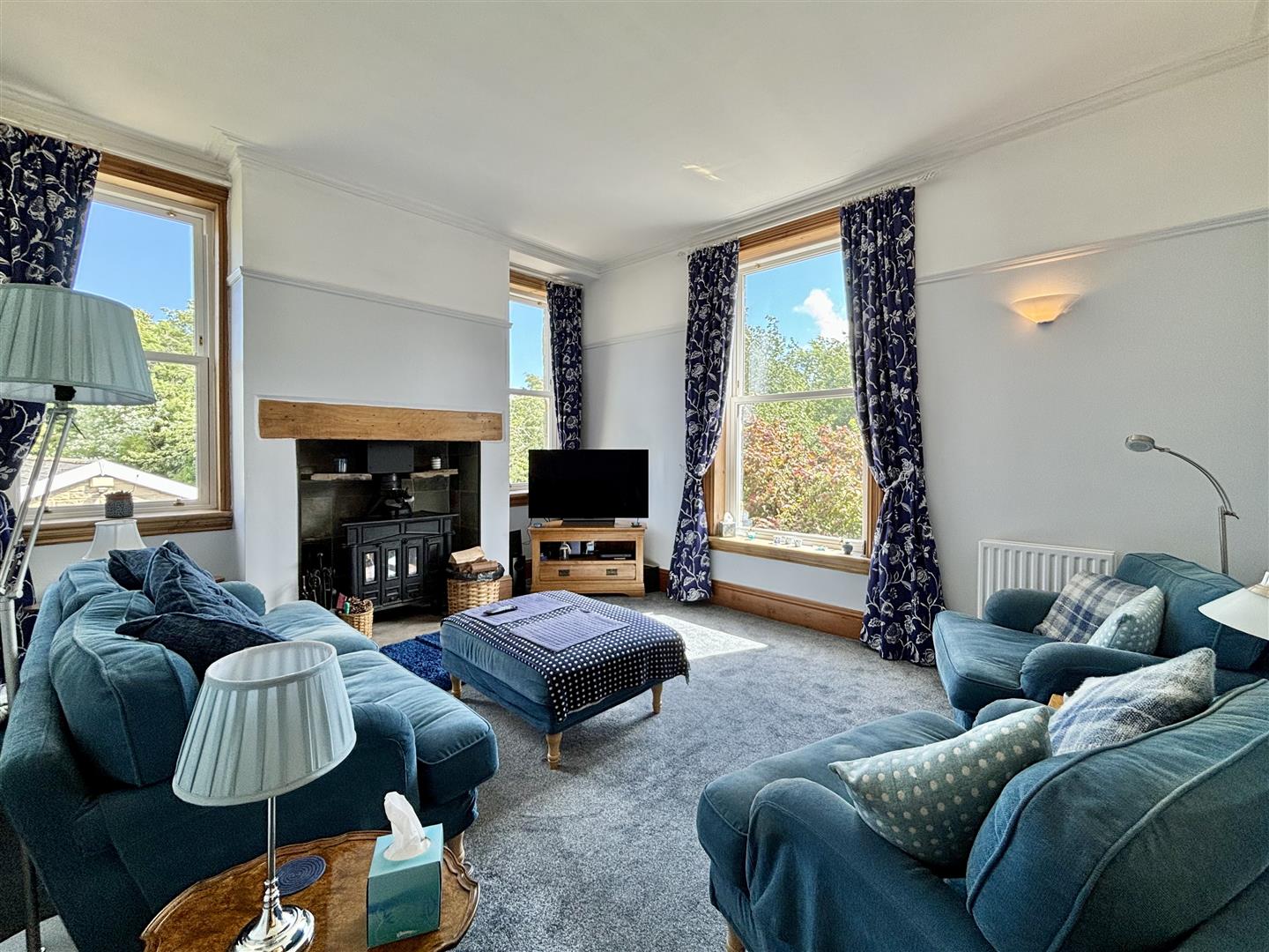 An impressive reception room with three large windows offering a pleasant outlook, large multi-fuel stove, three wall lights and two central heating radiators.