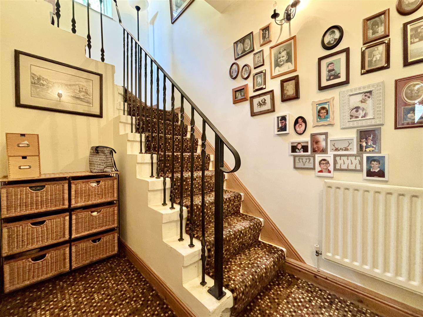 Window to the side elevation, staircase with wrought iron balustrade and doors off to the kitchen, utility and gym/office.