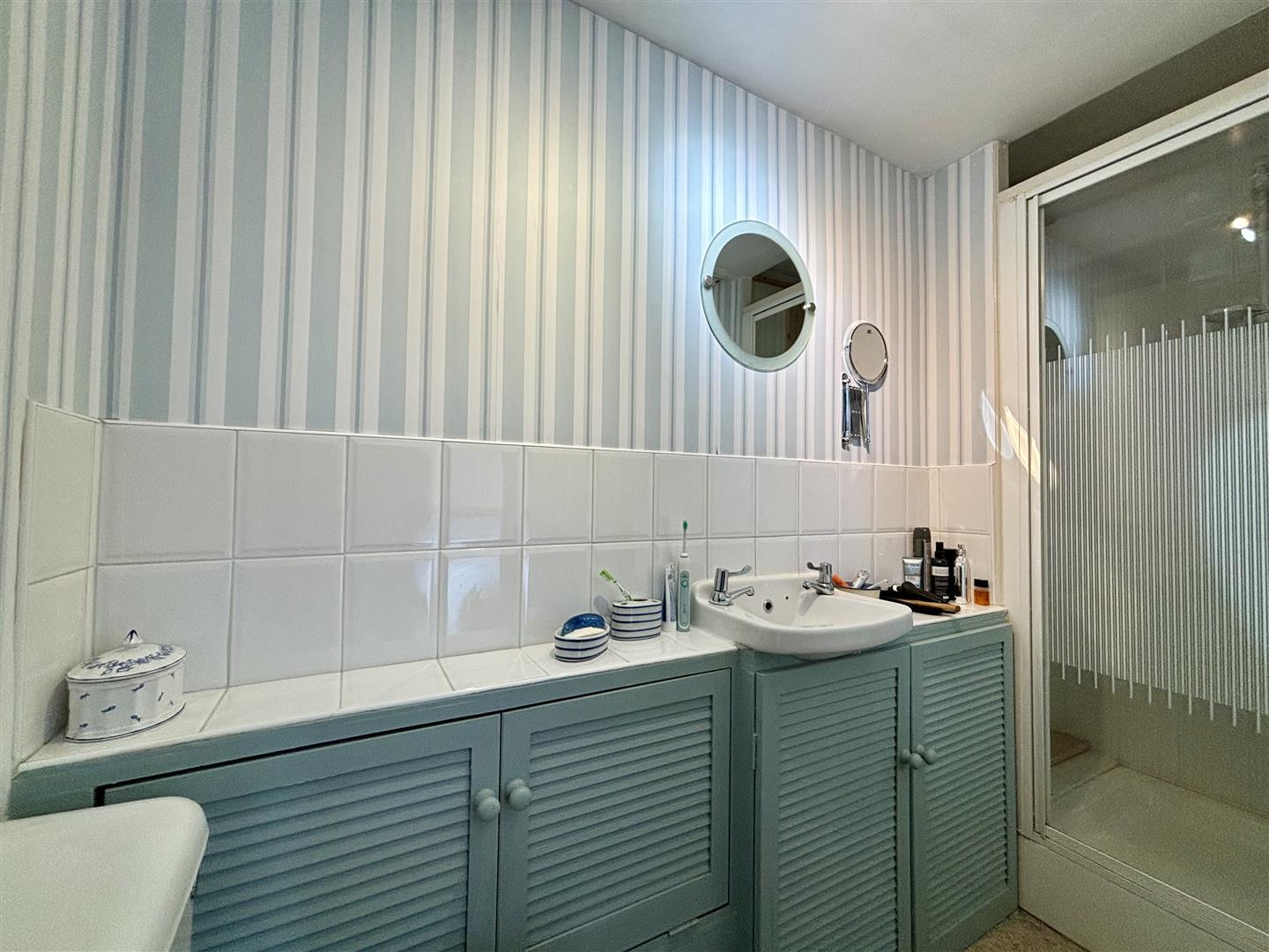 Comprising of a walk-in shower cubicle with an electric shower, WC and a washbasin with storage below. Central heating radiator.