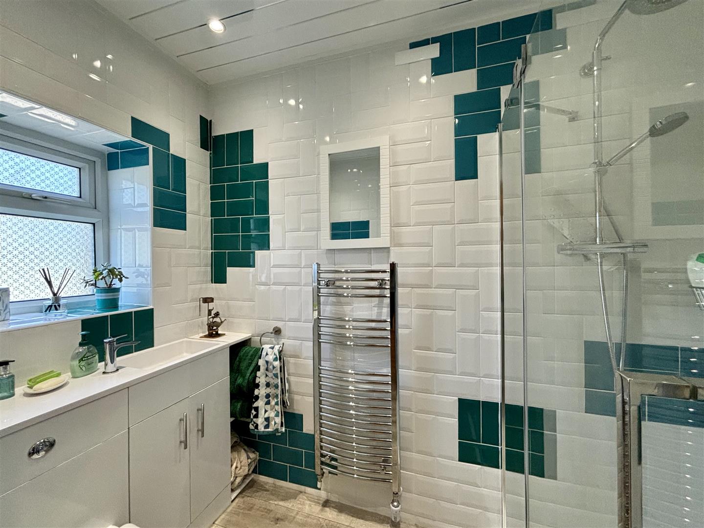 A superb fully tiled shower room comprising of a double width rainfall shower, low flush WC and a washbasin with mixer tap and storage below. Extractor, heated towel rail and a window to the side elevation.