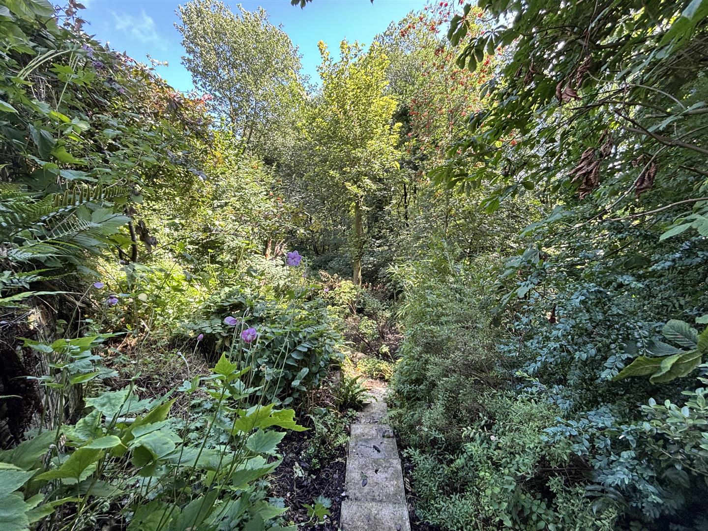 To the front of the property is a resin drive with parking for two-three cars, flowerbeds and a gate with steps down to the rear garden. To the side is a shared driveway with further off-road parking. To the rear and side is a private garden consisting of two paved patio seating areas, outdoor WC, several flower beds and mature shrubs and trees. From the patio, steps lead down to a further secluded woodland area where the old railway lines once ran.