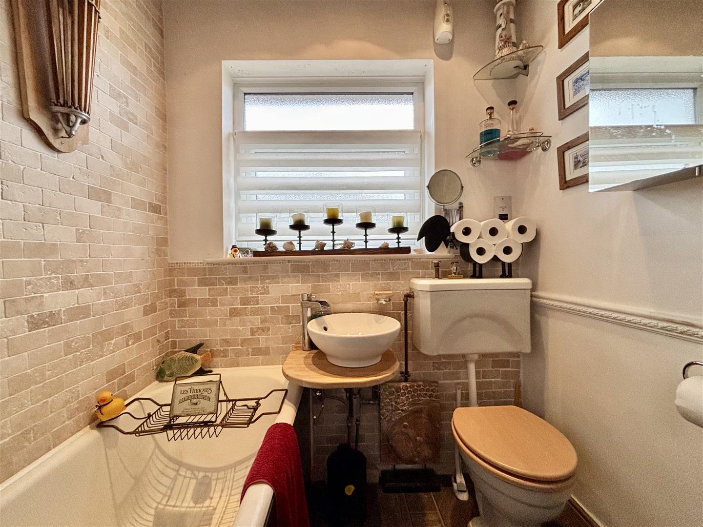 Panelled bath and electric shower over, circular wash basin with a waterfall style tap, W/C, extractor fan and a window to the rear.