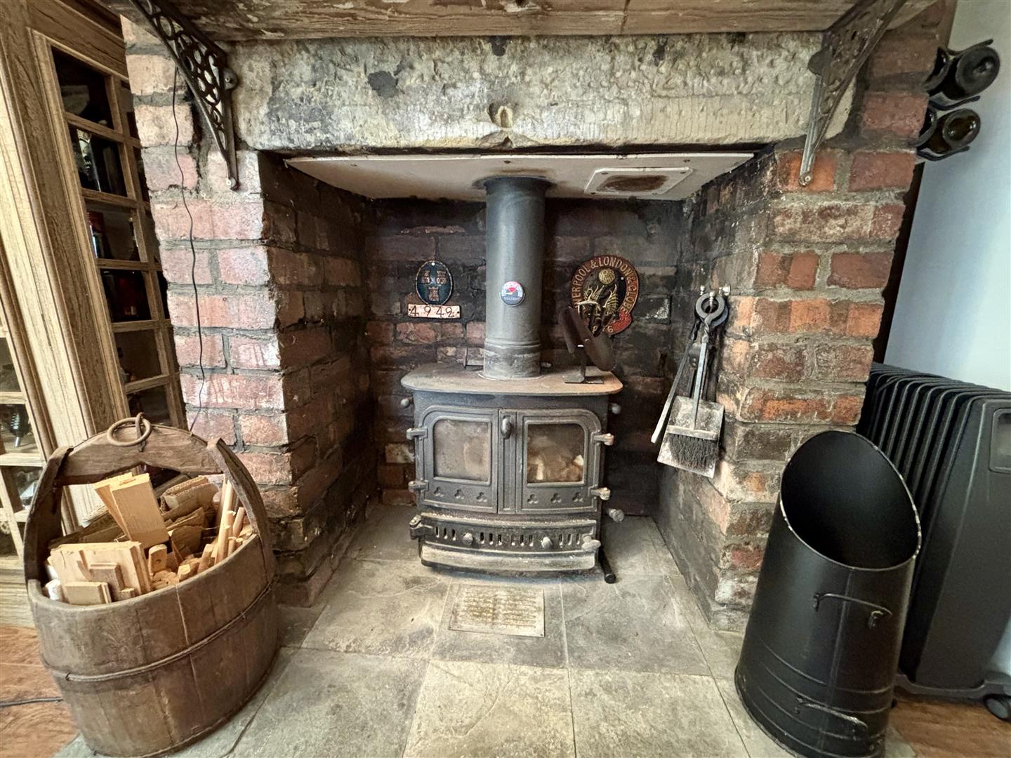 Multi fuel stove + exposed stone surround, central heating radiator, french doors to the rear, laminated flooring and a window to the side elevation. The kitchen area consists of fitted base and wall units, a Belfast sink, integrated NEFF electric double oven, four ring gas hob and extractor above, plus plumbing for a washing machine.