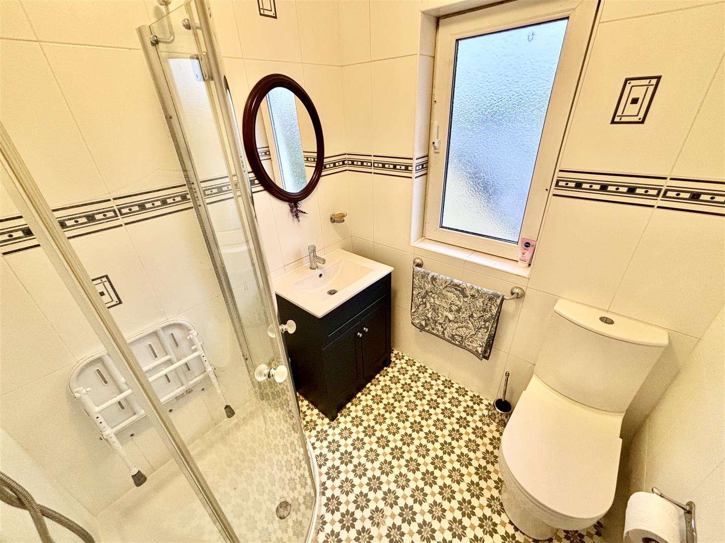 A modern fully tiled shower room with a corner shower cubicle, washbasin with mixer tap and storage below, WC, window to the rear elevation and a central heating radiator.