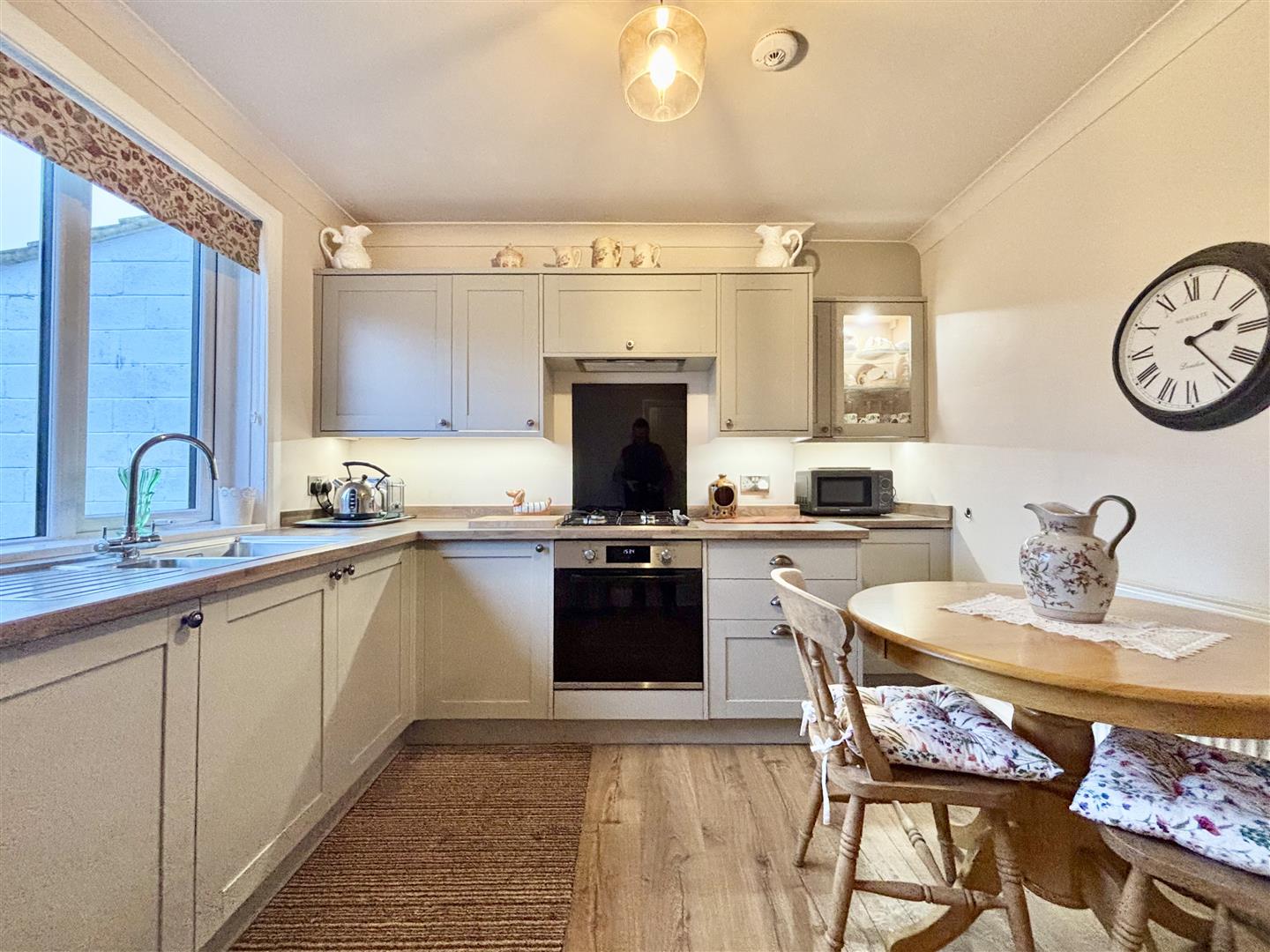 A modern Howdens kitchen (fitted in 2024) with a good range of base and wall cabinets, laminated work surfaces and matching upstands. Integrated appliances include a fridge, electric oven, four ring gas hob and an extractor above. Stainless steel sink and drainer, central heating radiator and a window to the rear elevation.