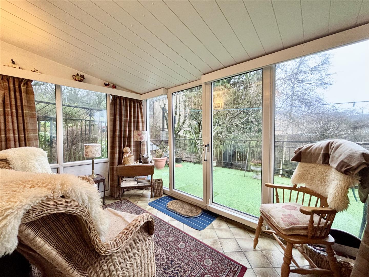 A white UPVC conservatory with patio doors leading out to a balcony seating area, two wall light points, central heating heating radiator and a door to: