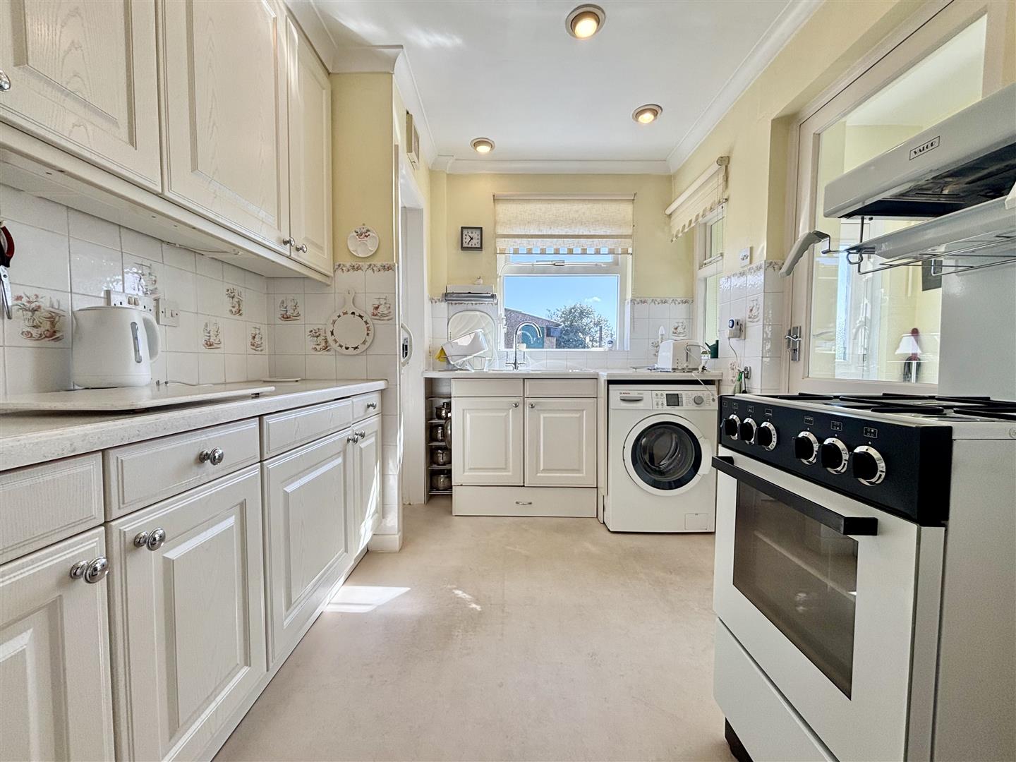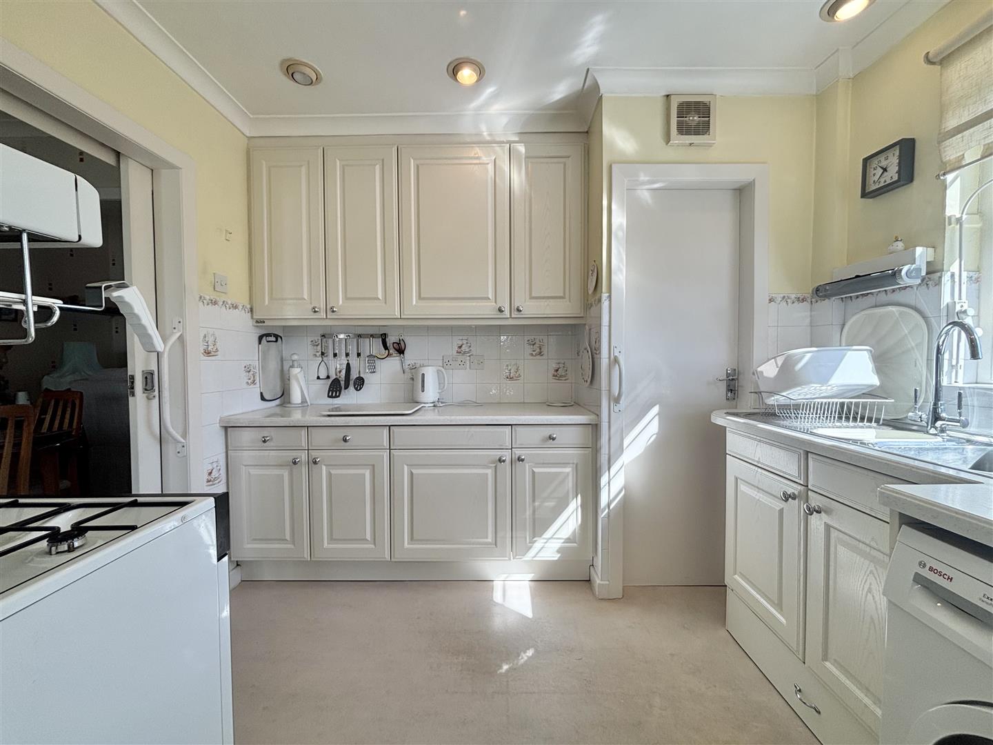 Fitted with a range of base and wall units, Corian work surfaces and splash-back wall tiling. Gas cooker point, plumbing for a washing machine and a stainless steel sink & drainer. There are windows to the side and rear elevations, a door to the porch and a useful pantry with a side window.
