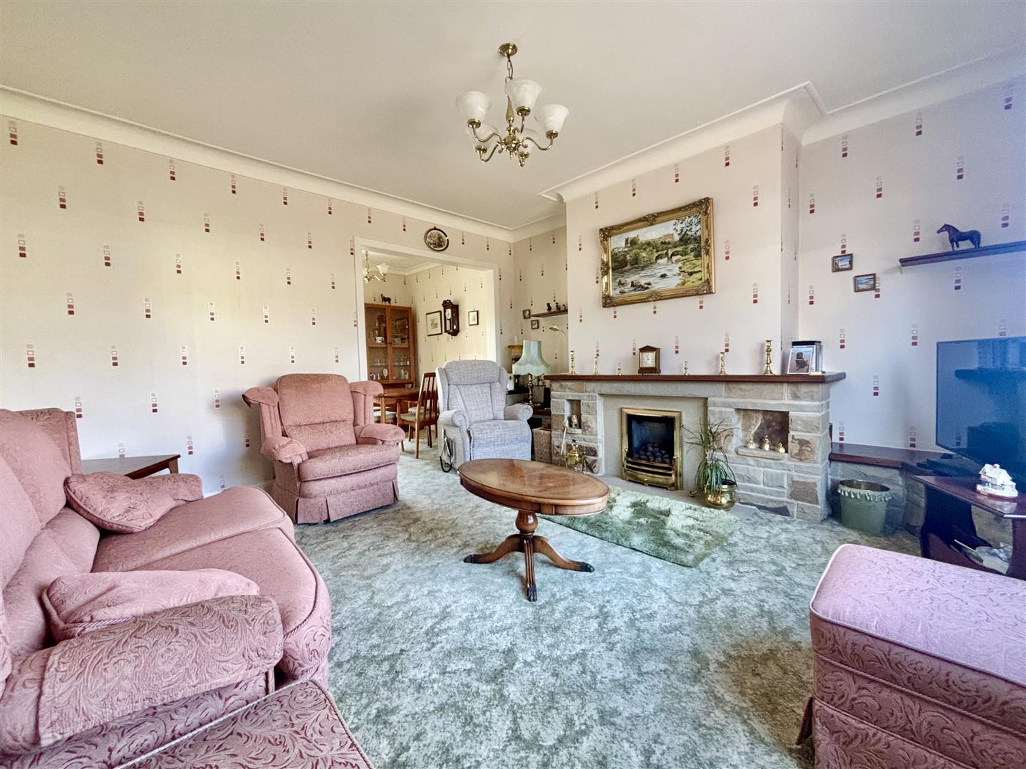 A well proportioned reception room with a window to the front elevation and an opening to the dining room. Feature stone fireplace with a living flame gas fire and a central heating radiator.