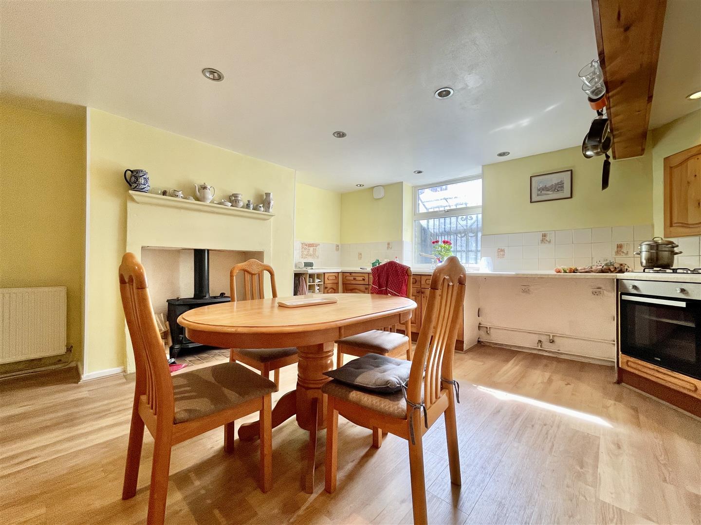 Located to the lower ground floor is the dining kitchen that benefits from the original stone fireplace and a cast iron log burner stove. There is a range of base and wall units, ample working surface space and an brand new integrated electric oven, a gas hob and an extractor above. Plumbing for a washing machine and dishwasher, along with exposed beams and a useful store room. Window to the front elevation.