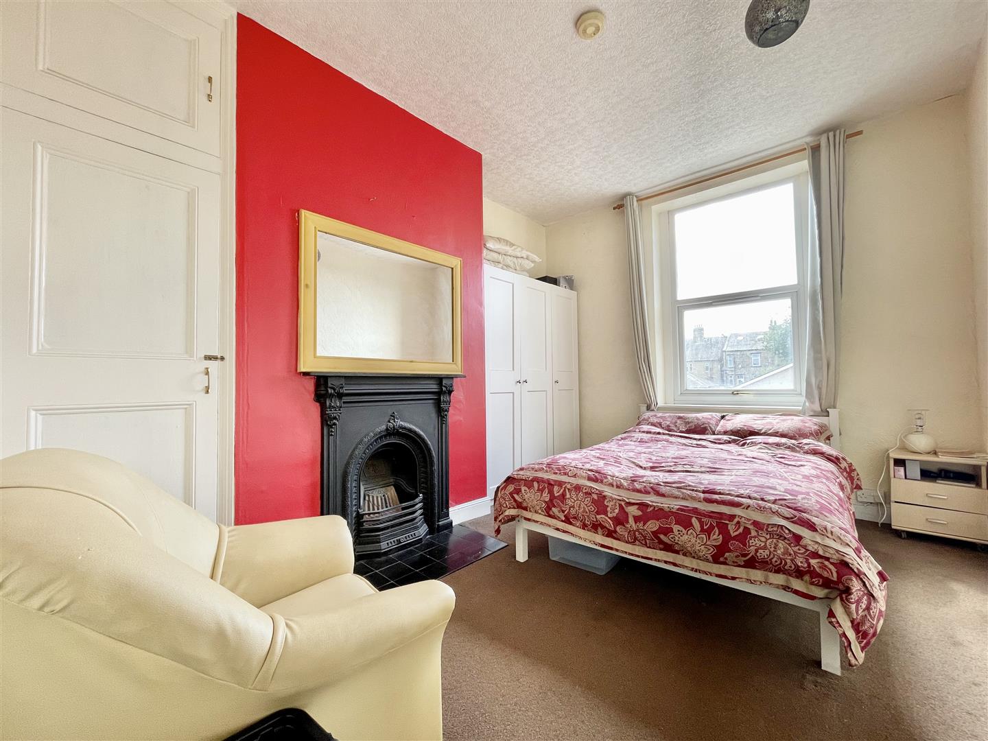 Window to the front elevation, a wrought iron fireplace, fitted storage cupboard and a central heating radiator.