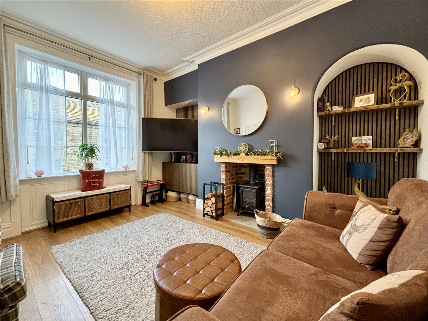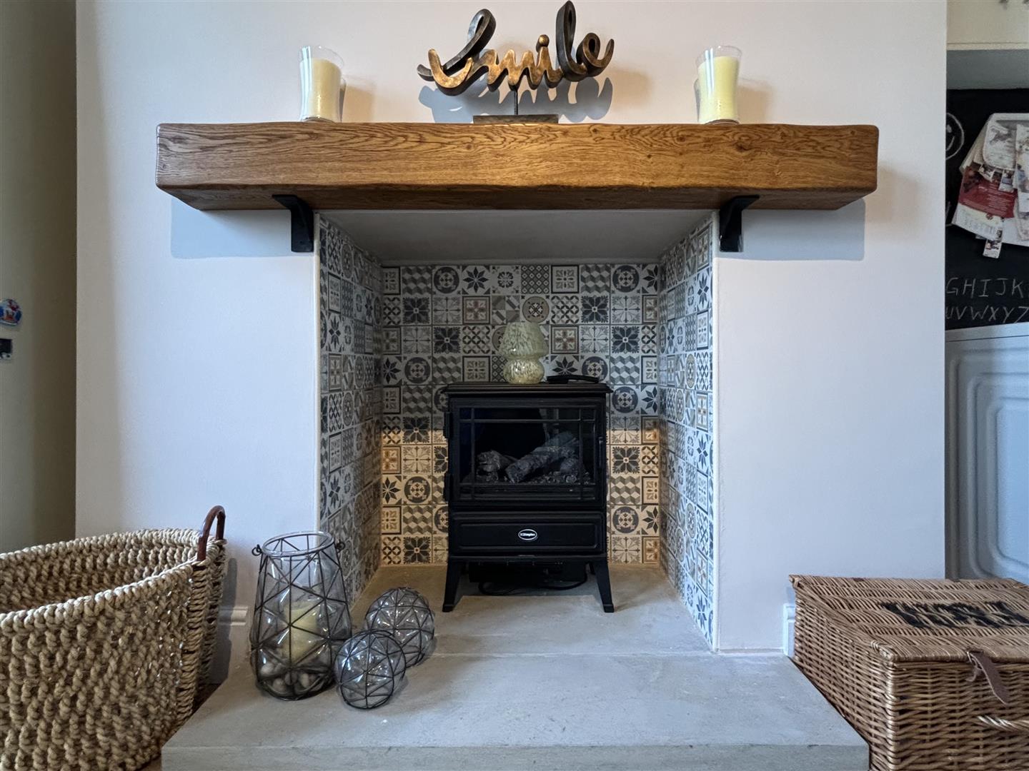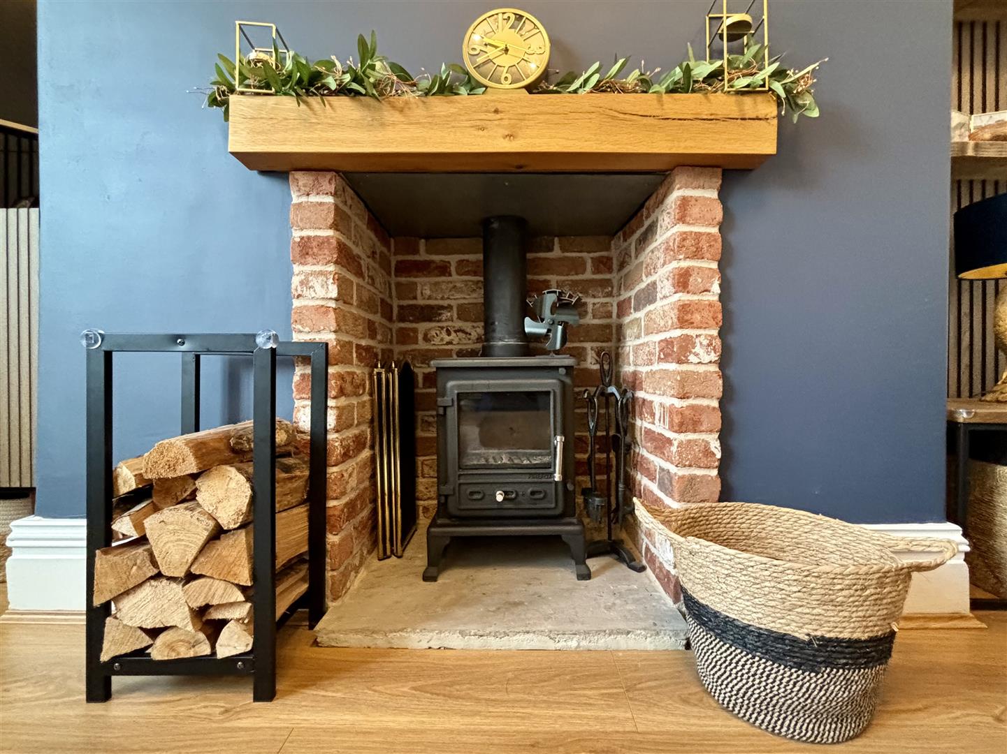 A characterful room with a high ceiling, solid fuel stove, arched alcove and feature wall panelling. Laminate flooring, window to the front elevation and a column style radiator. Door to the kitchen.
