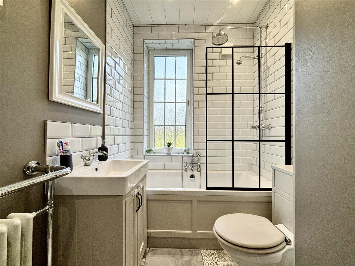 A modern family bathroom comprising of a panelled bath with centre telephone style taps, crittall style shower screen and a rainfall shower over, modern rectangular washbasin with storage below and a low flush WC. Window to the rear elevation, laminate flooring and a column style radiator with integral towel rail.