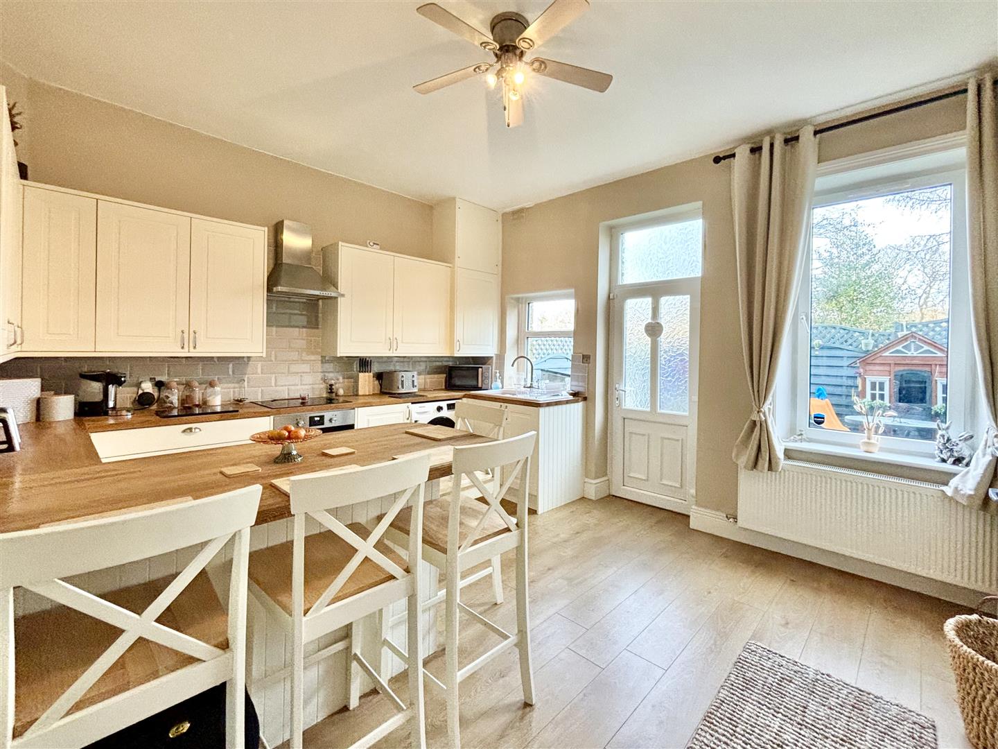 A spacious fitted kitchen with a large breakfast bar and a range of fitted base and wall units. Feature fireplace recess with tiled inlay and space for an electric stove. Integrated electric oven, electric hob and extractor above plus plumbing for a washing machine and an enamel sink & drainer. There are windows to the rear elevation and an external door leading to the rear garden. Door to the cellar.