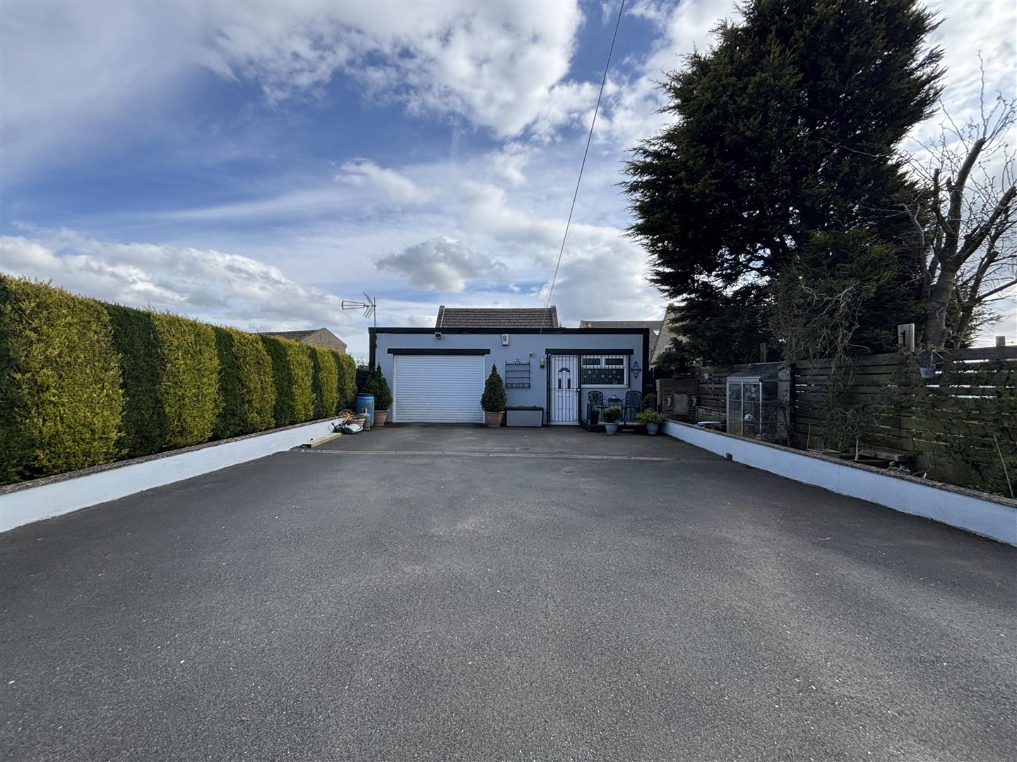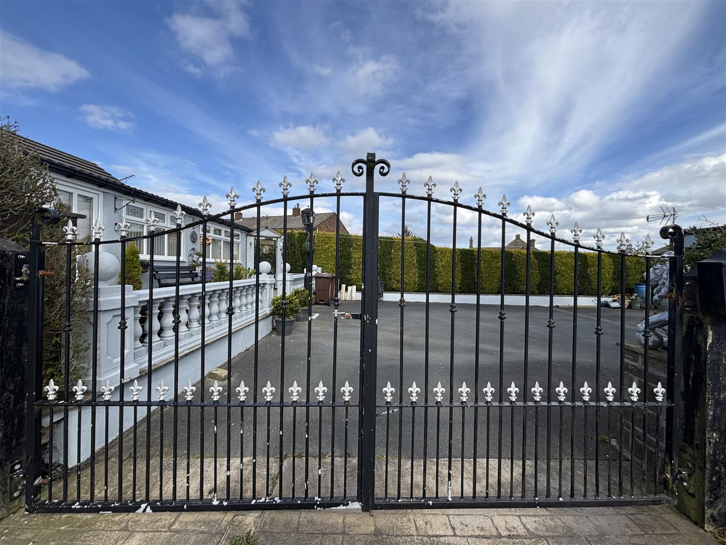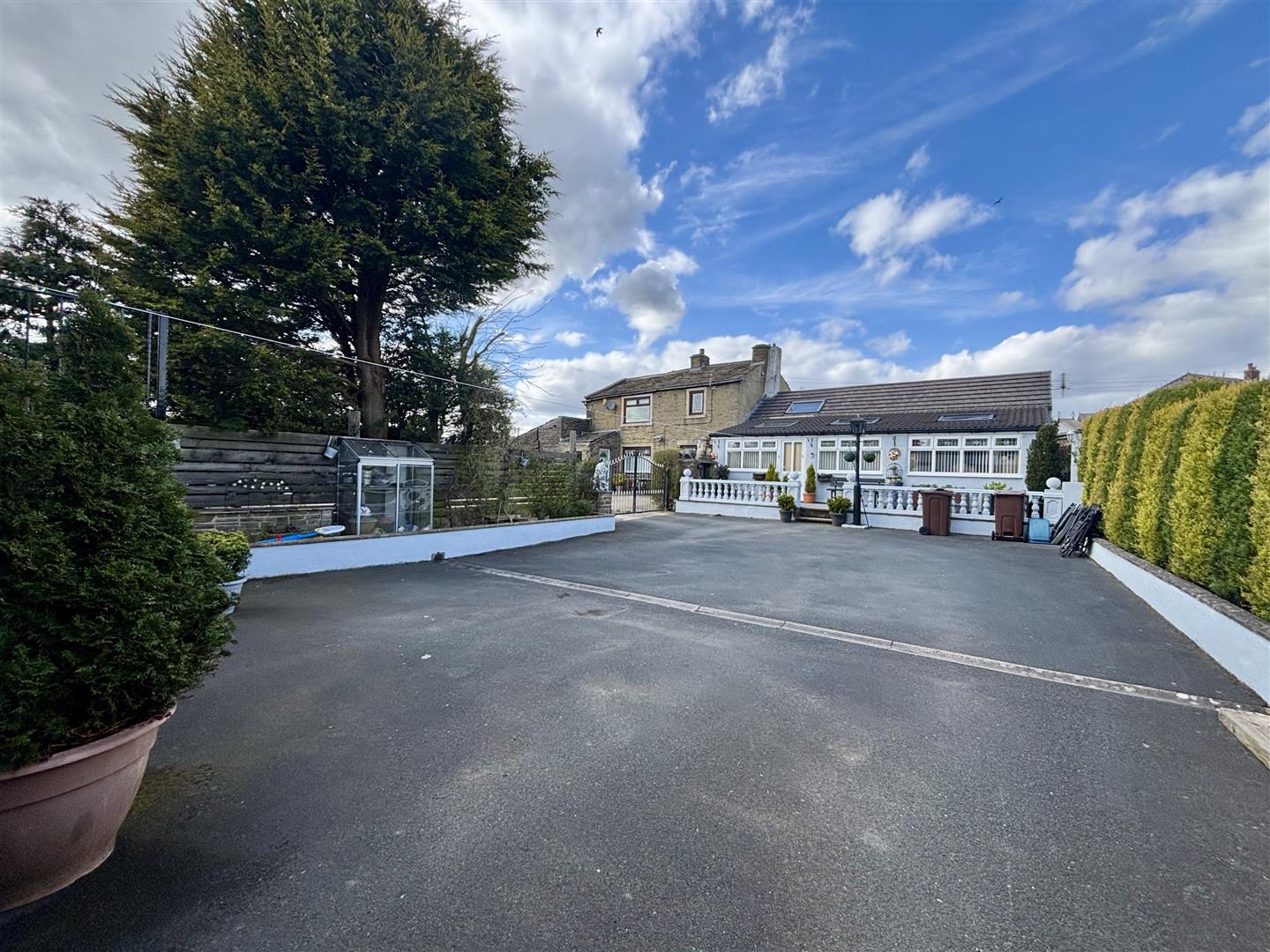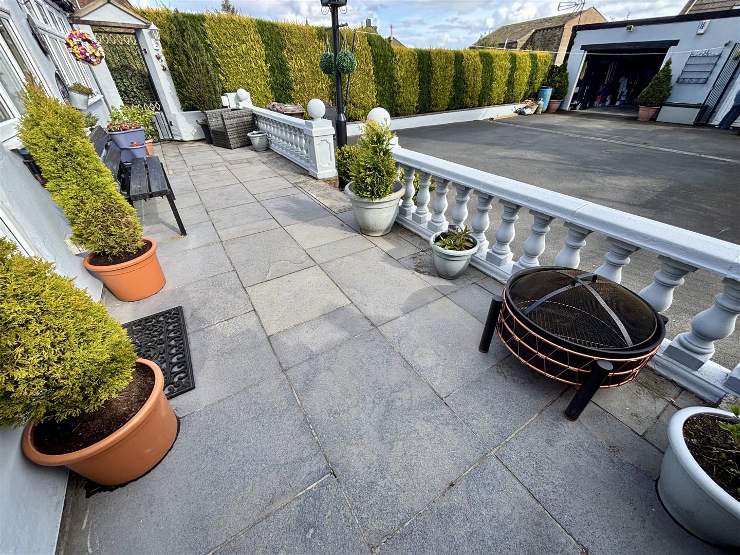 The property is accessed through double gates onto a large tarmac driveway. To the front is a raised, paved patio seating area with stone balustrade and to the rear is a smaller paved patio and garden shed. A pathway at the side of the house leads to the rear with secure lockable gates.