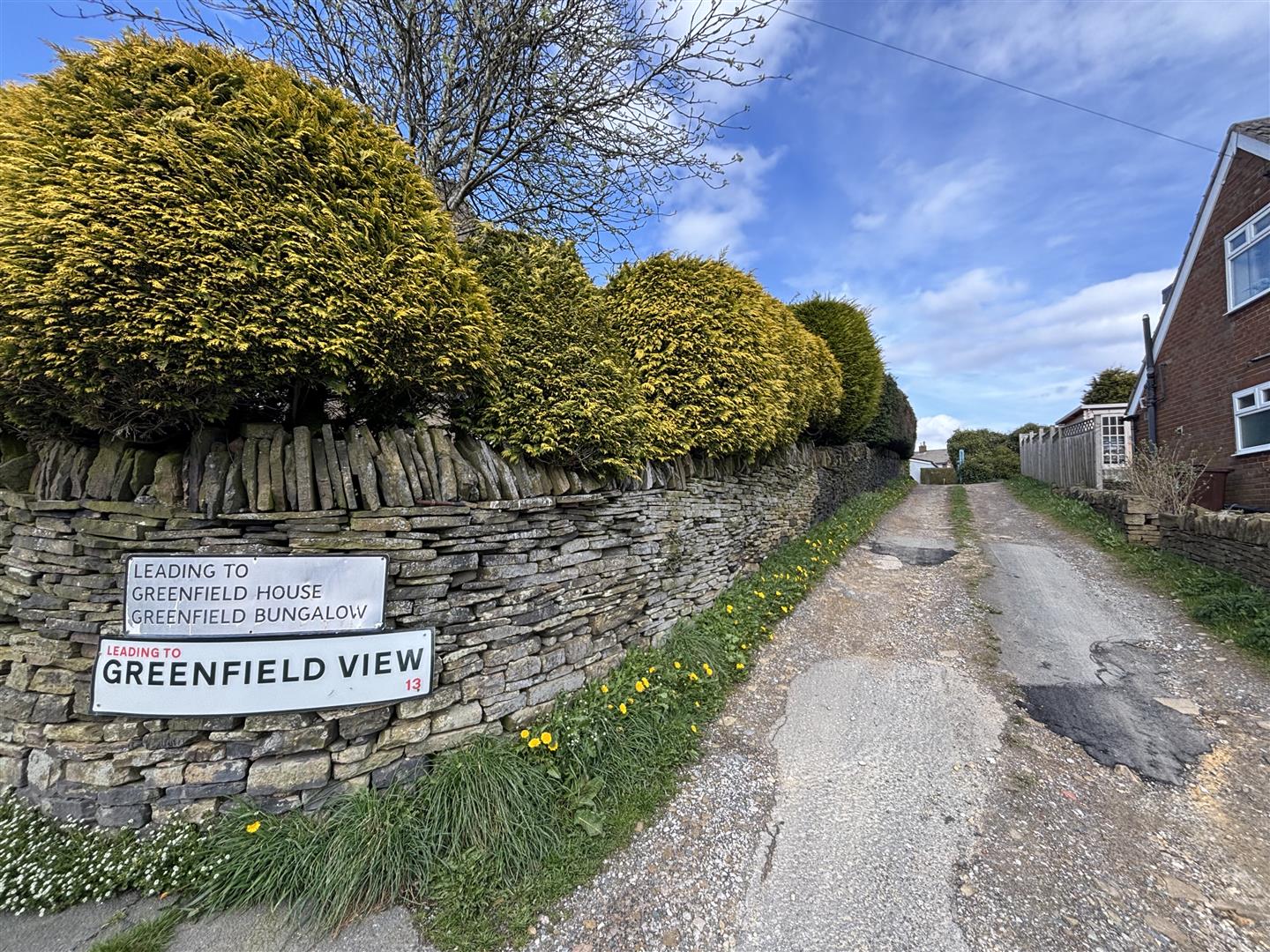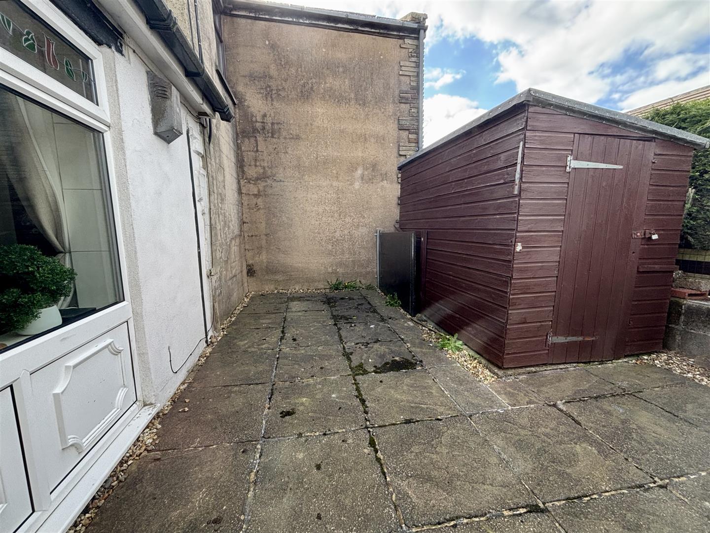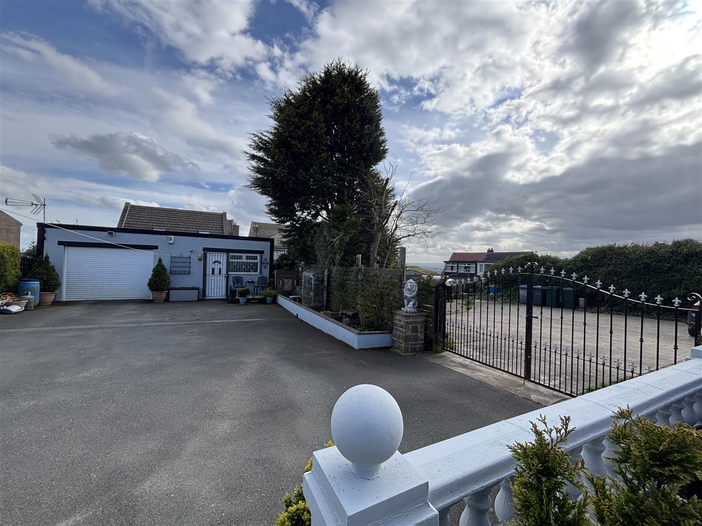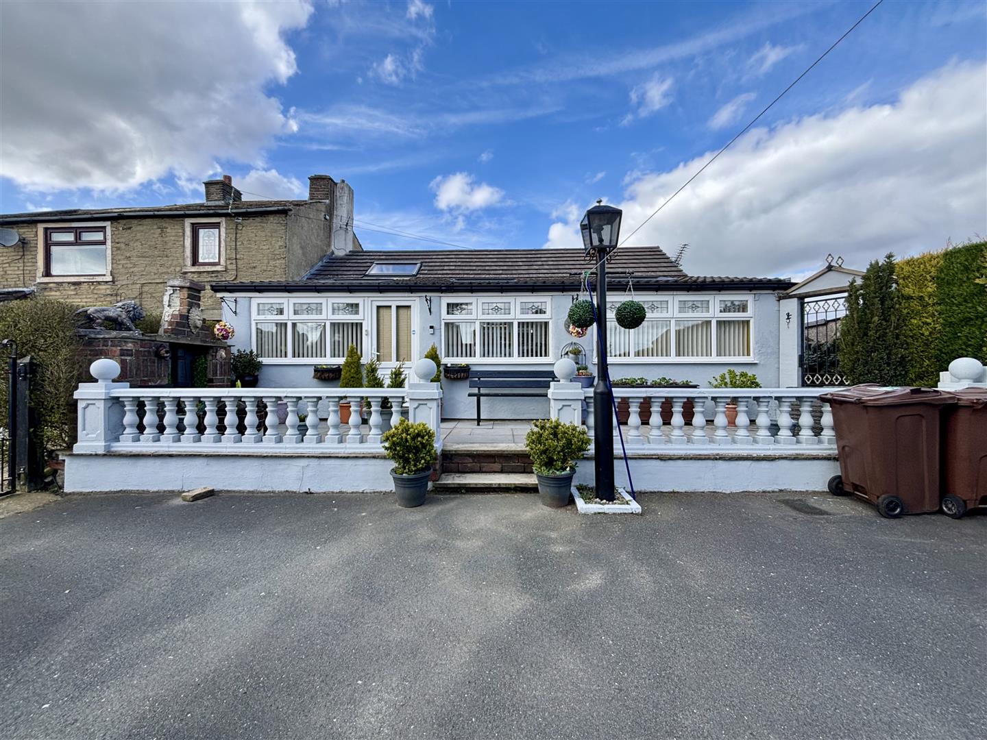 The property is accessed through double gates onto a large tarmac driveway. To the front is a raised, paved patio seating area with stone balustrade and to the rear is a smaller paved patio and garden shed. A pathway at the side of the house leads to the rear with secure lockable gates.