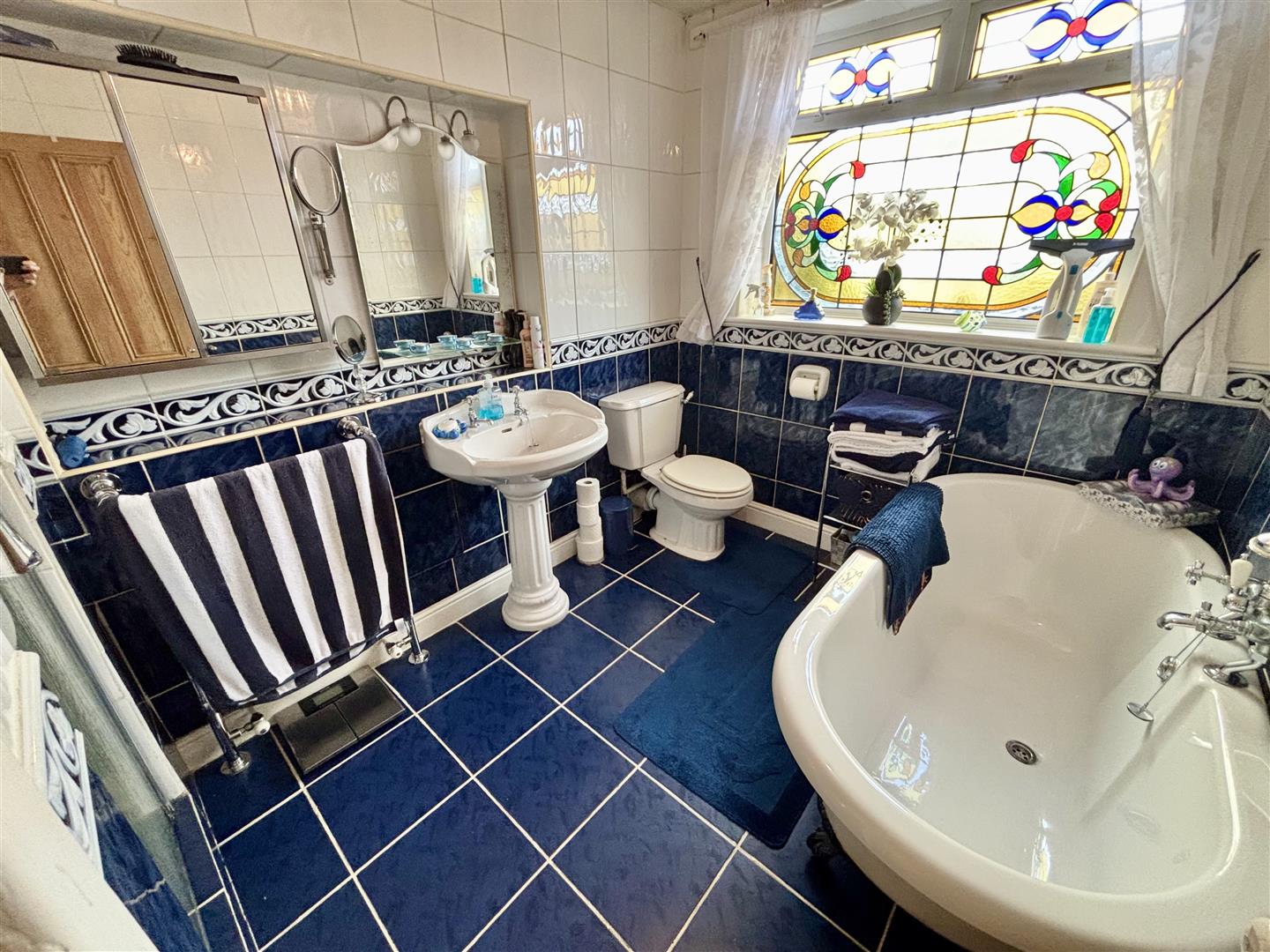 A four piece, fully tiled bathroom with under-floor heating, comprising of a roll-top bath with telephone style taps, pedestal washbasin, low flush WC and a walk-in shower enclosure with glass door and a mains powered shower. Feature stained glass window to the side elevation and a heated towel rail/radiator.