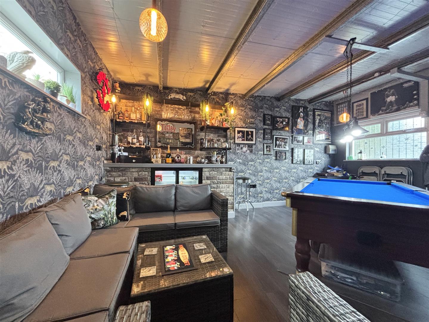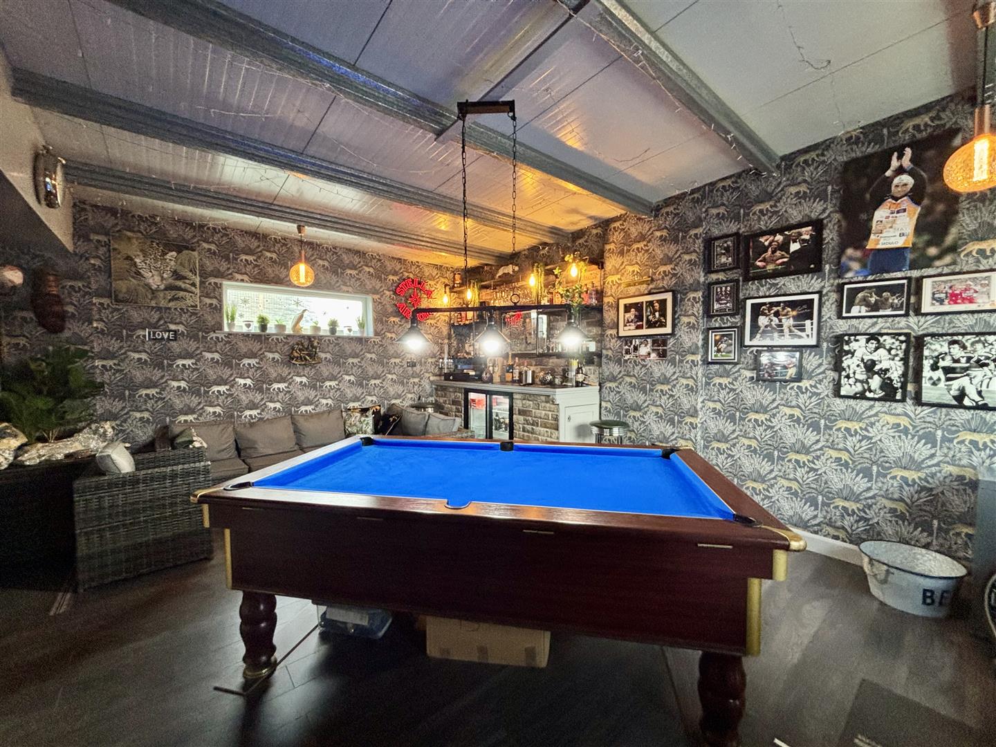 An impressive room currently housing a pool table, bar and dart board! A great place to entertain and also offers further potential for a variety of uses. Electric wall heater, under-floor heating and an external door & window to the front elevation.