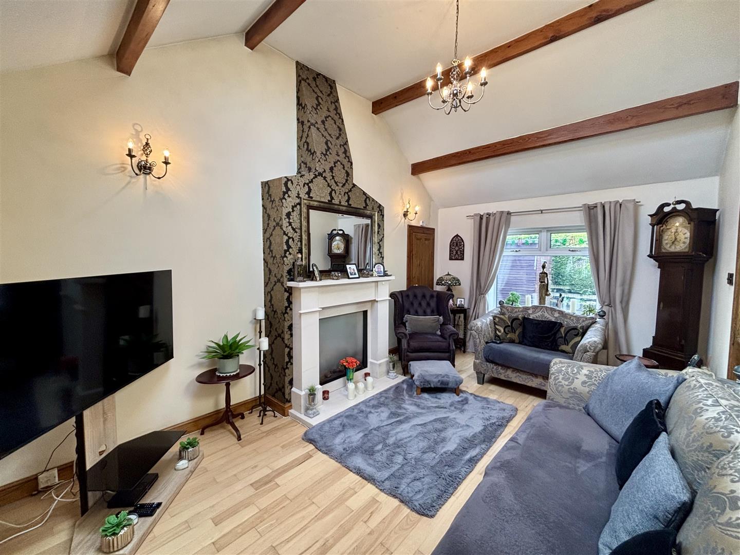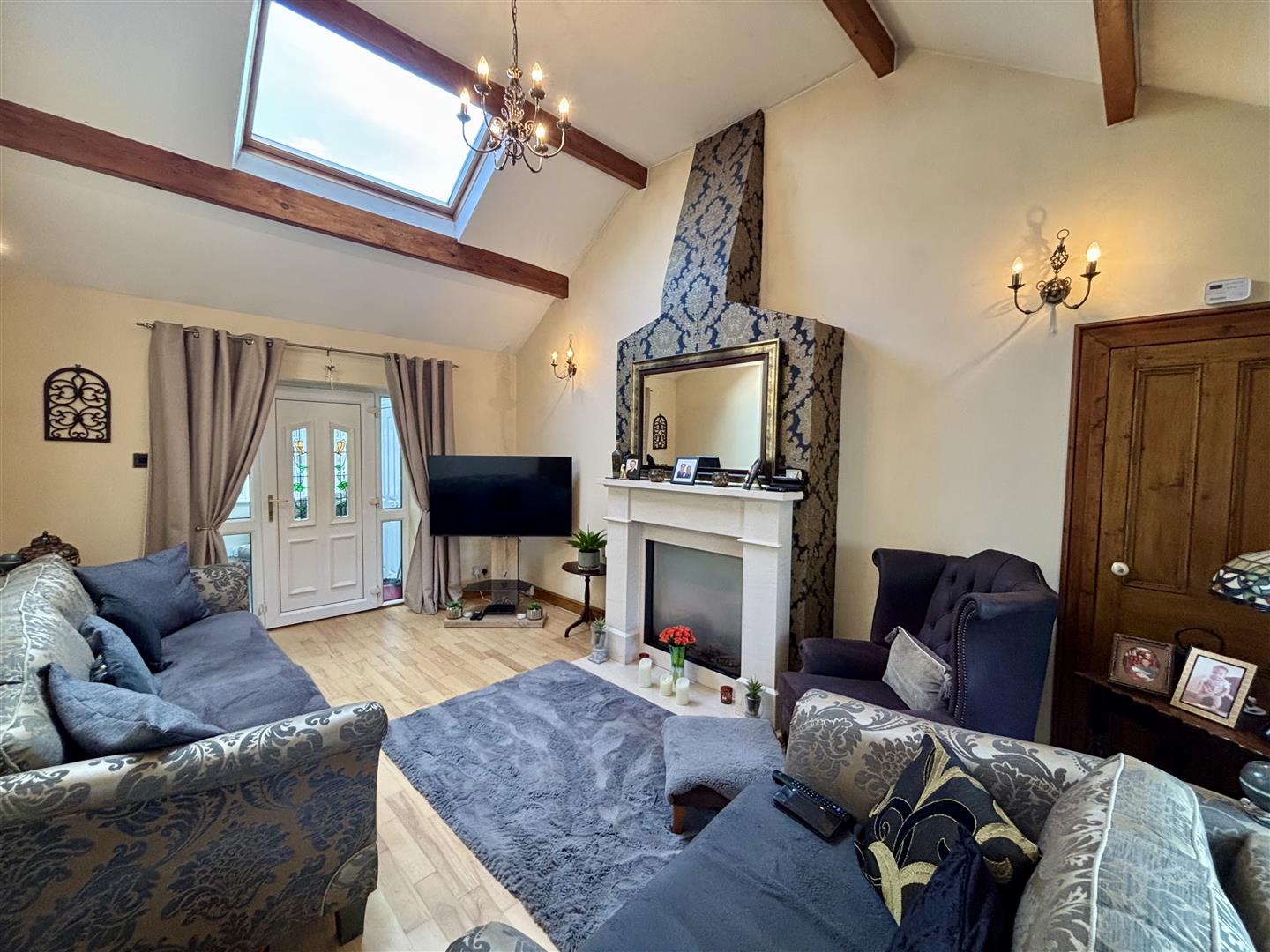 An impressive reception room with a full height ceiling, Velux roof window, exposed beams and a marble fireplace with a modern glass-fronted log effect gas fire. Window to the rear elevation, central heating radiator and a door to the kitchen.