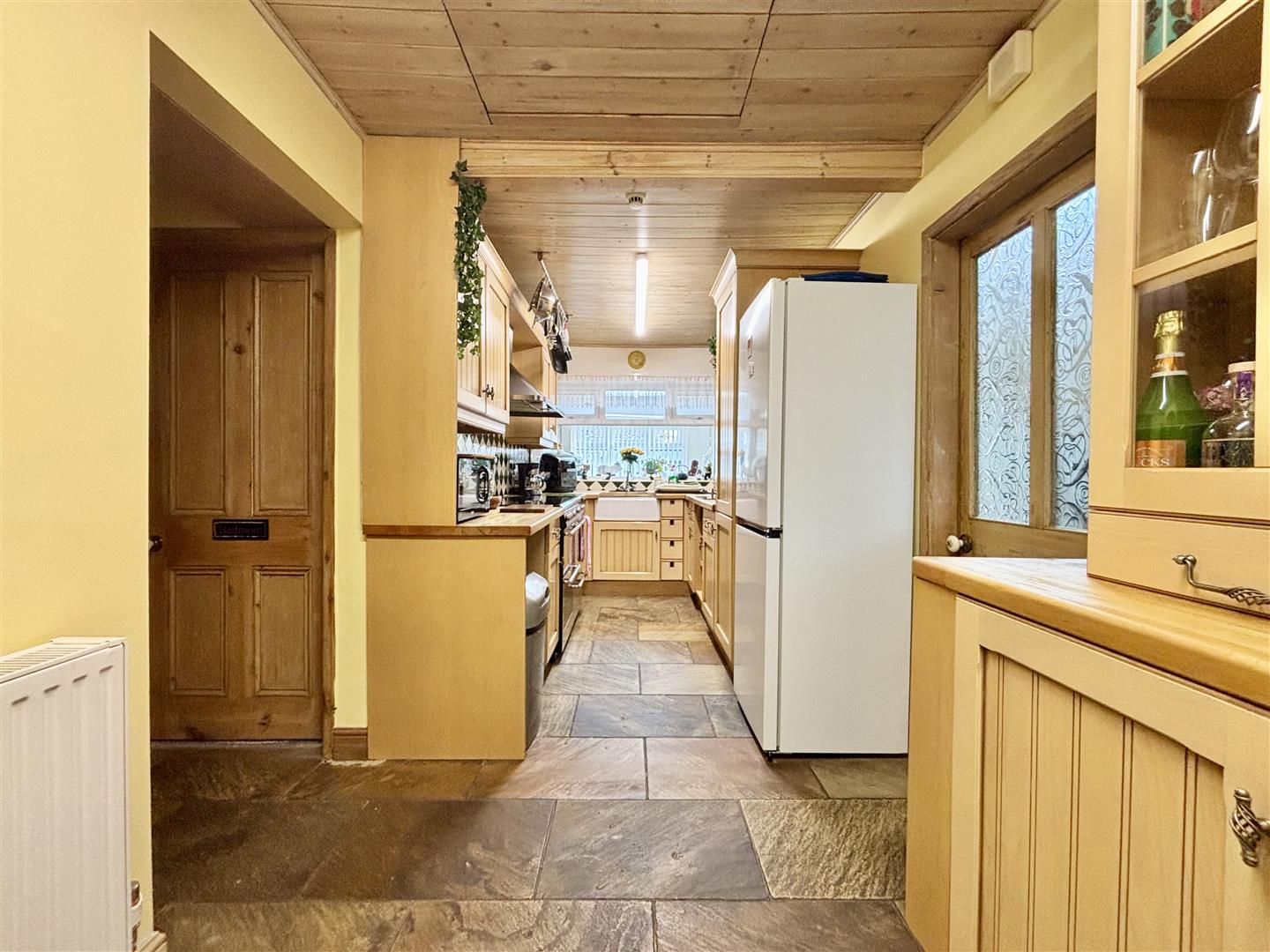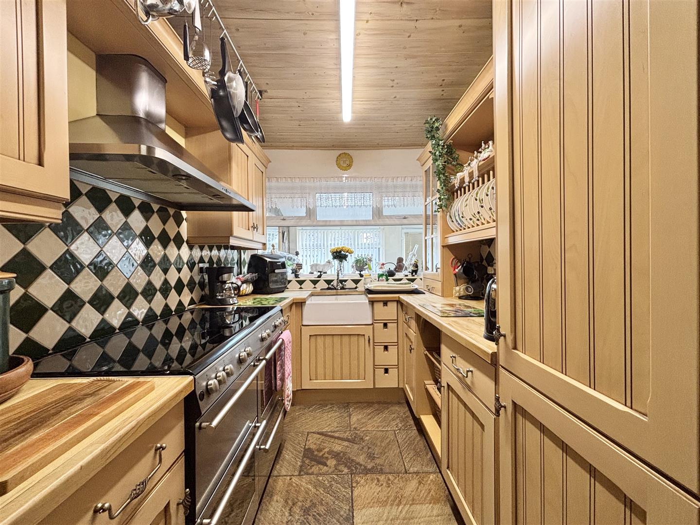 A fully fitted kitchen with a good range of base and wall cabinets, laminate work surfaces and splash-back wall tiling. A double range oven with seven gas rings, two ovens, grill and extractor are included in the sale. Belfast sink, hatch to a loft space, window to the front elevation and doors off to the bedrooms and bathroom.